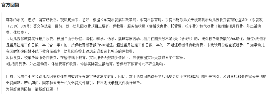 对于退费问题待开学后,市教育局会给予学校和幼儿园相关指引,及时回应和处理家长关切的退费问题。若此期间,国家和省出台相关退费文件指引,我市则按最新文件执行退费。