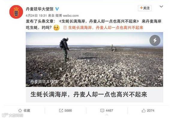 “丹麦驻华大使馆官微虽然不知道发生了什么事,但昨晚很高效率地推出了旅游指南,景点包括生蚝养殖场。