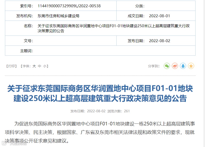 秉承深耕中心城区“一心两轴三片区”建设,打造世界级的城市商业综合体标杆,加快推进国际商务区“世界智造门户、湾区魅力都心”建设,东莞拟在国际商务区F01-01地块建设一幢建筑高度约450米的超高层建筑,现拟启动东莞国际商务区华润置地中心项目F01-01地块建设250米以上超高层建筑事项行政决策程序。
