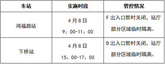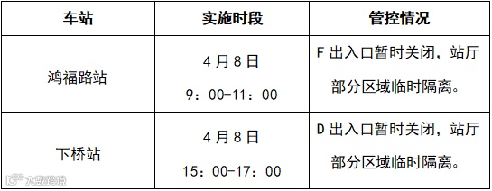 根据演练工作需要,2022年4月8日,东莞轨道交通2号线下桥站、鸿福路站部分出入口将暂时关闭,地铁站站厅部分区域将临时隔离,具体安排如下: