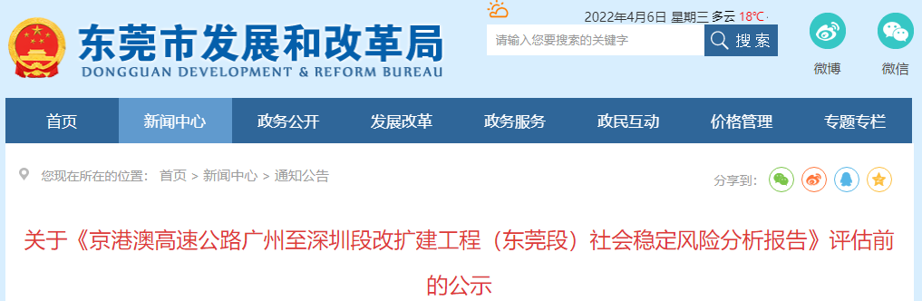 近日,市发改局网站公布关于《京港澳高速公路广州至深圳段改扩建工程(东莞段)社会稳定风险分析报告》评估前的公示(以下简称公示)。