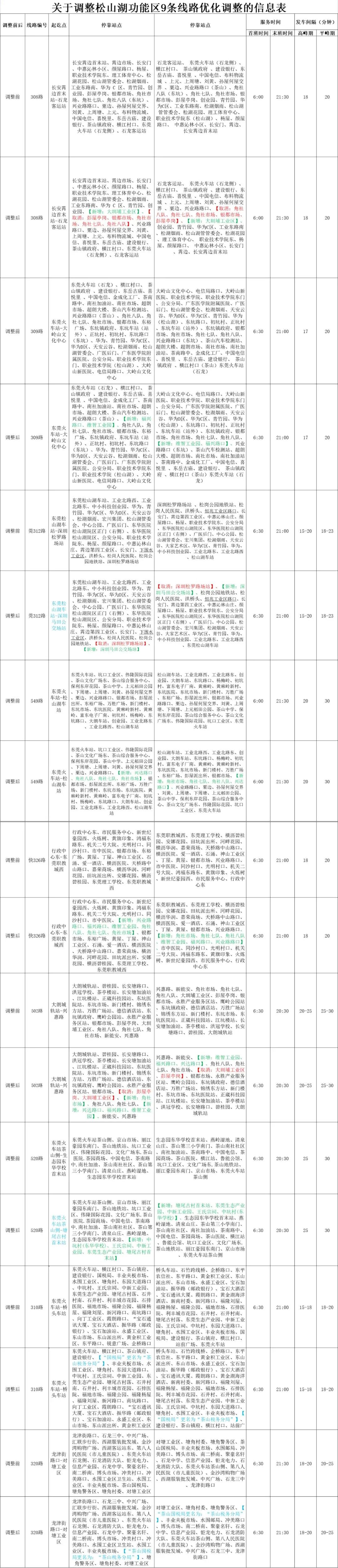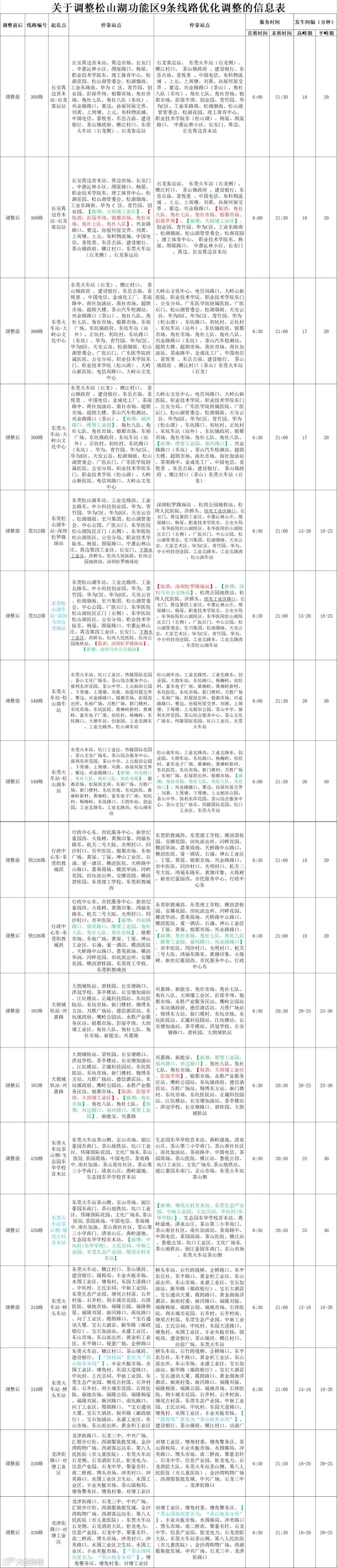 由于东坑角社大桥恢复通行,为了满足角社村居民出行需求,松山湖公交公司于7月18日对如下9条线路进行优化调整。具体调整如下: