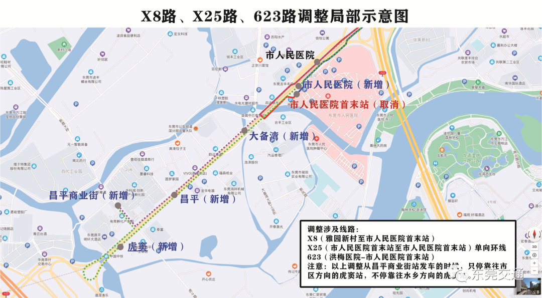 2022年7月23日起,X8路、X25路将调整至“昌平商业街”始发,中途增加停靠市人民医院、大备湾、昌平、虎窦(仅停靠往万江方向)站点。