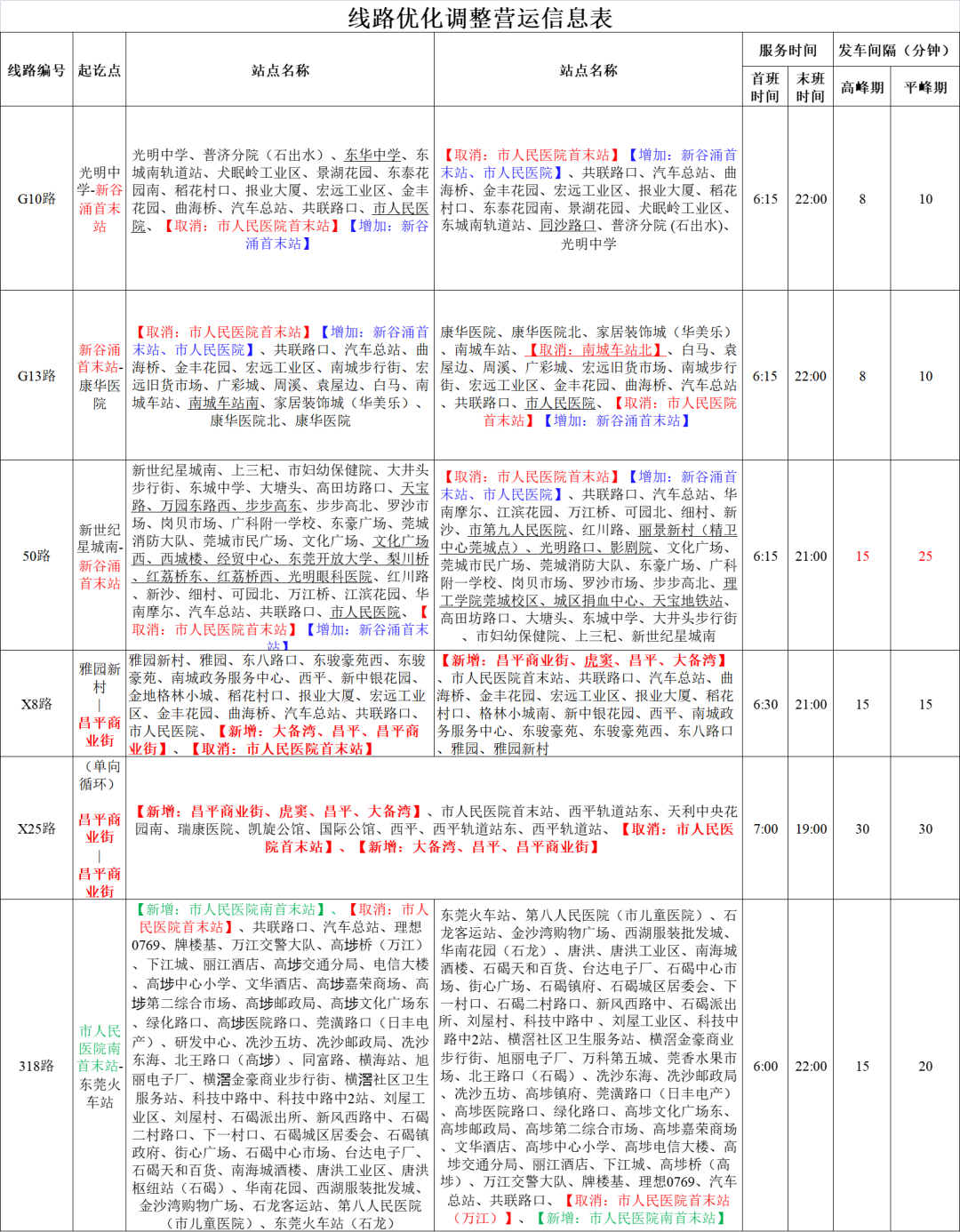 途经站点双向增加:中坑村(东华学校)、王氏宗祠、中新工业园、东莞生态产业园、塘尾古村首末站。