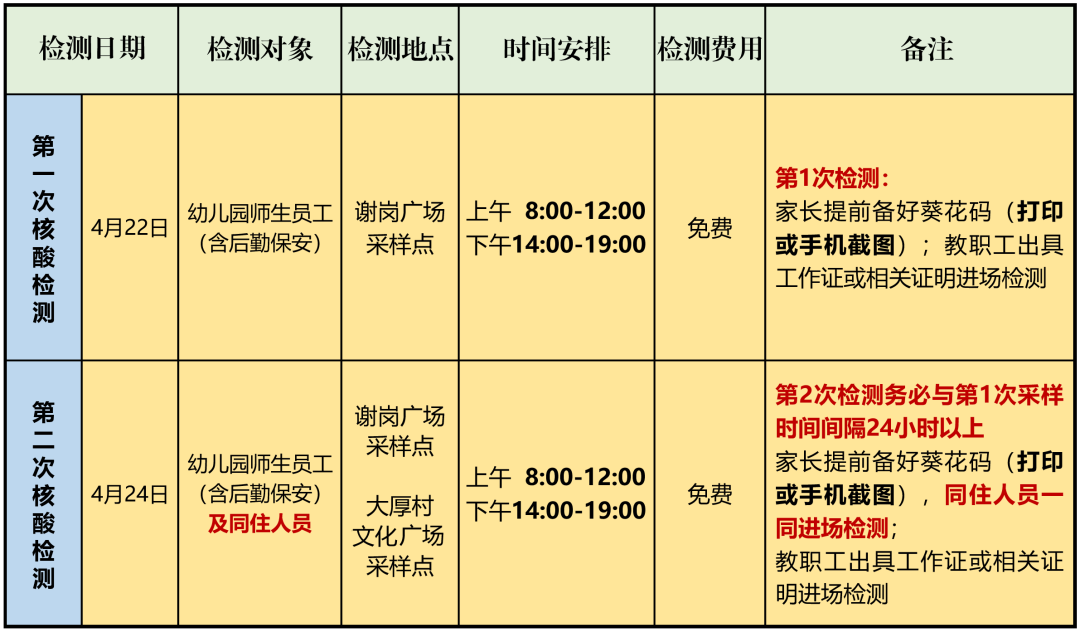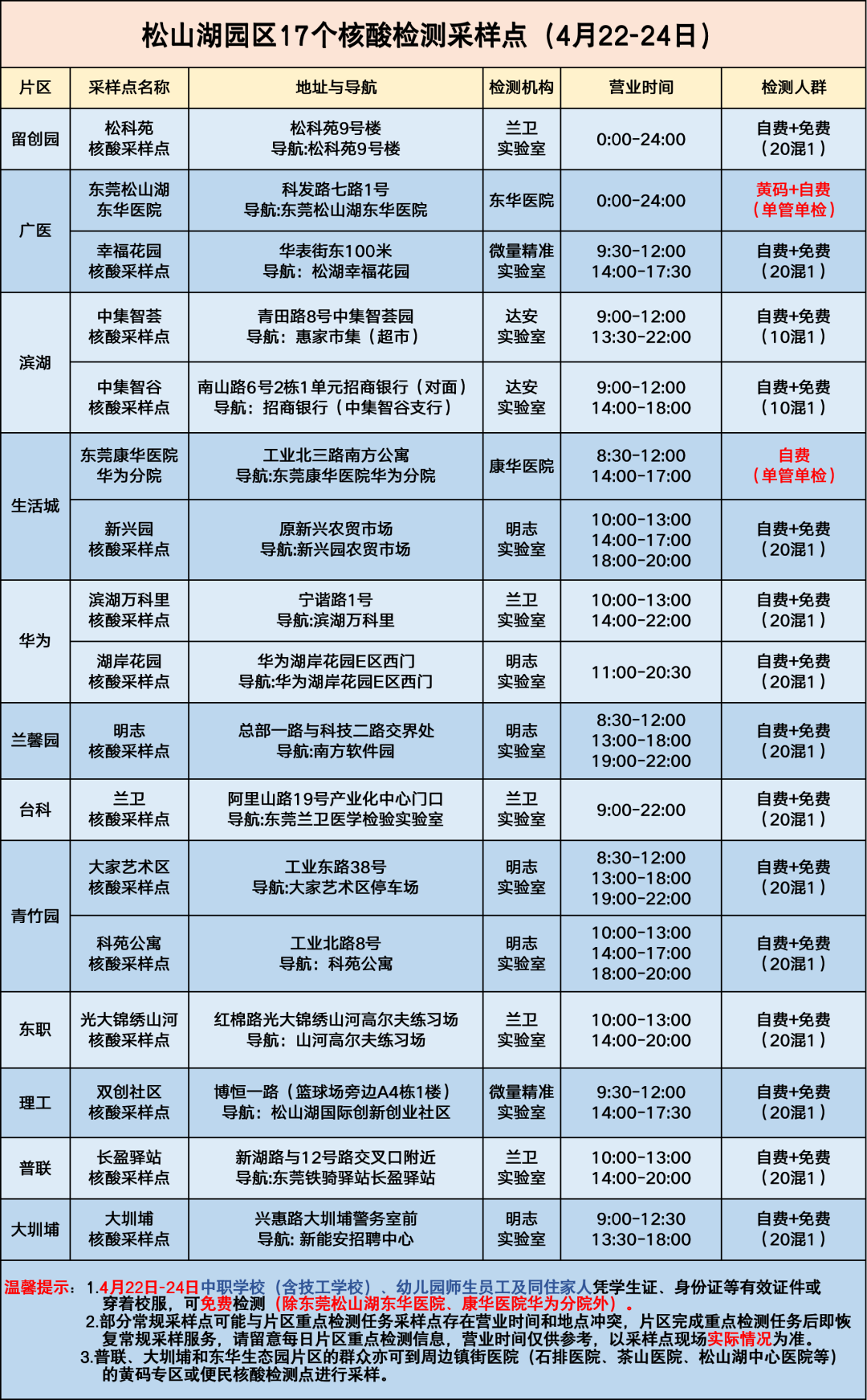 根据工作安排,中职学校(含技工学校)、幼儿园在返校前,师生员工需进行4天2检,同住家人需在返校前进行1次核酸检测,凭师生员工本人和同住家人48小时核酸检测阴性证明返校。松山湖对返校师生进行免费核酸检测,现就有关事项通告如下: