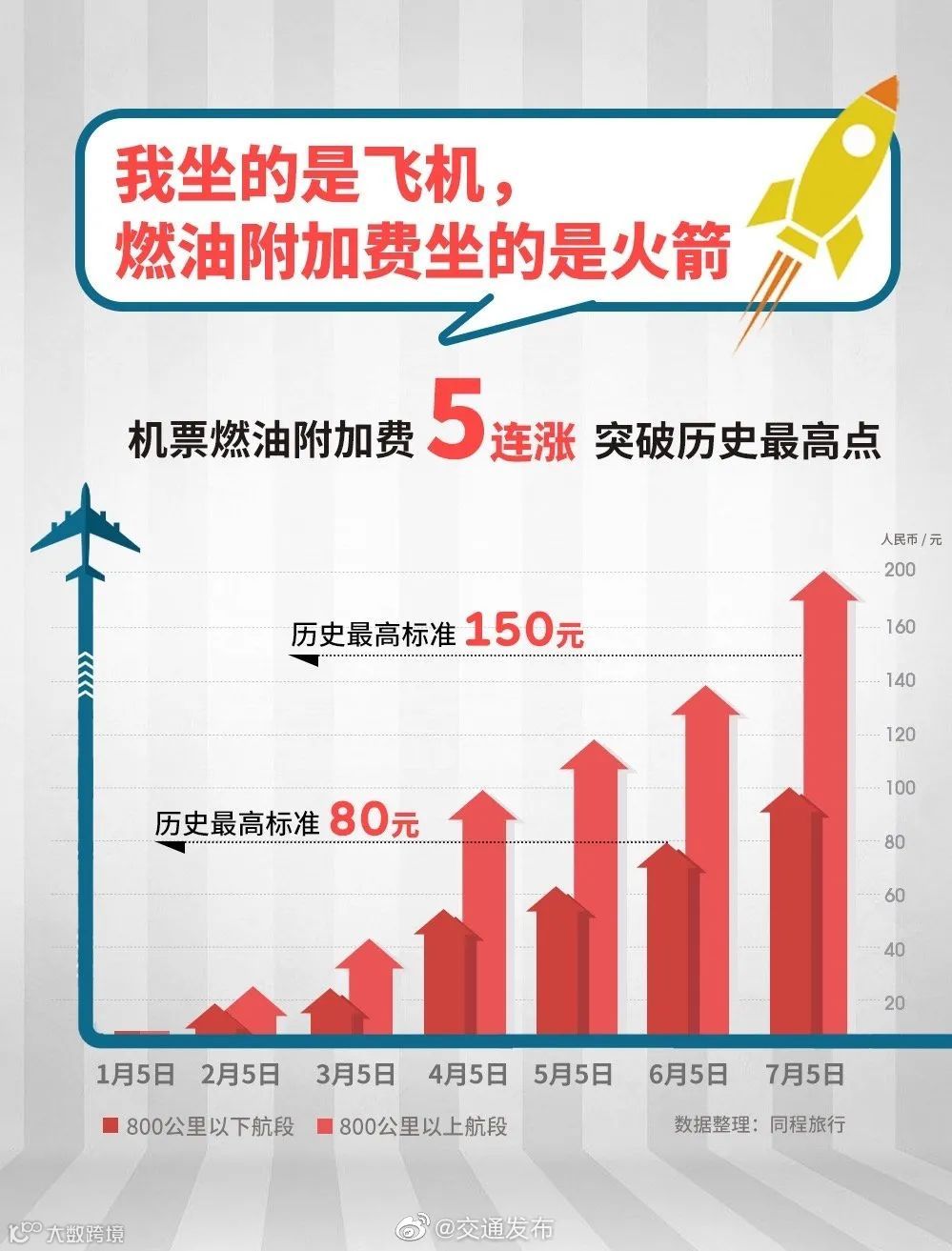 近日,多家航司宣布,将于7月5日零时起上调燃油附加费收取标准。据悉,这已是今年2月燃油附加费恢复征收以来第5次涨价,创下历史新高。
