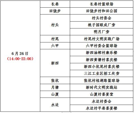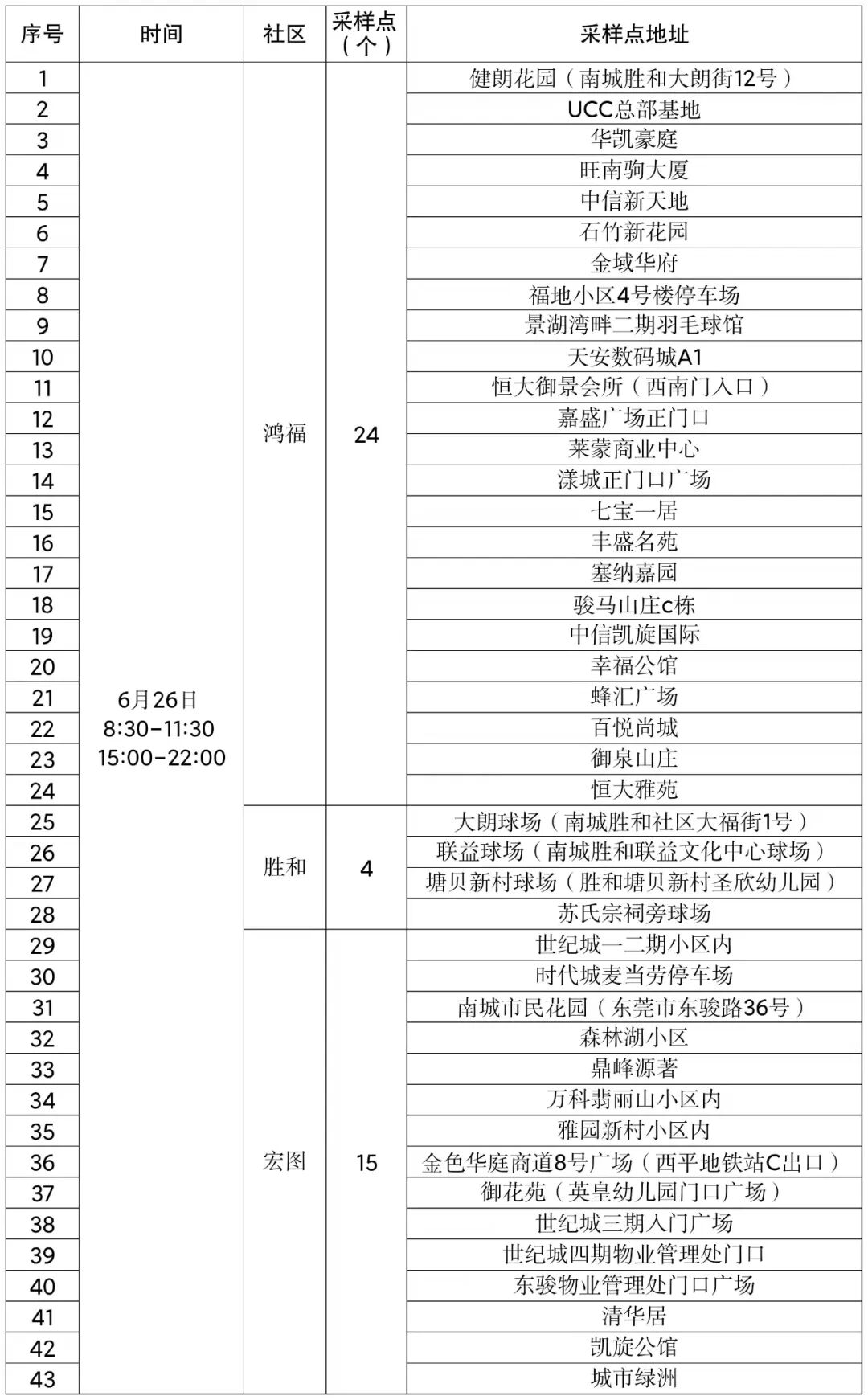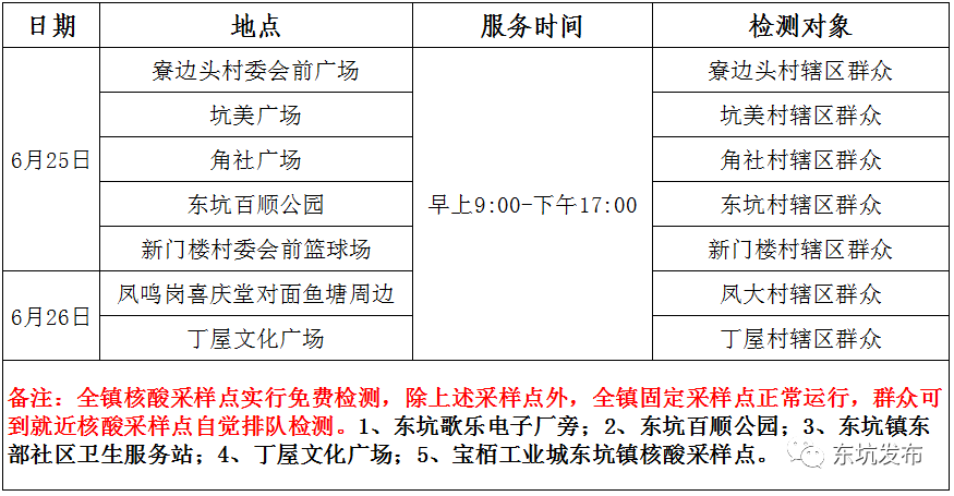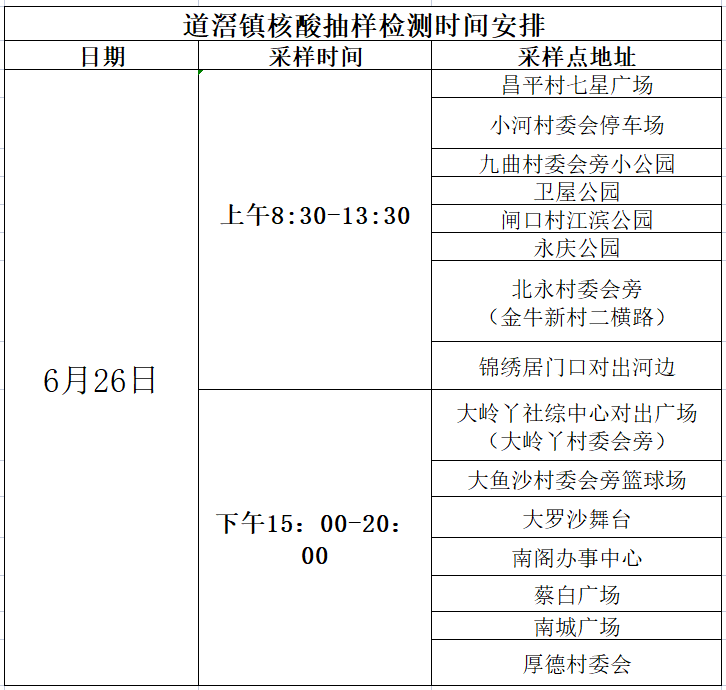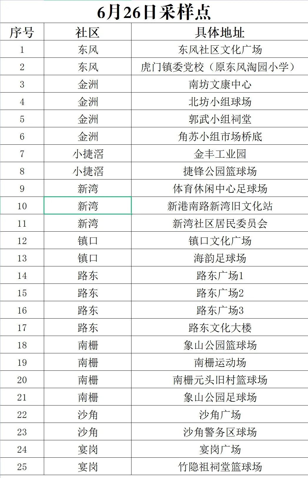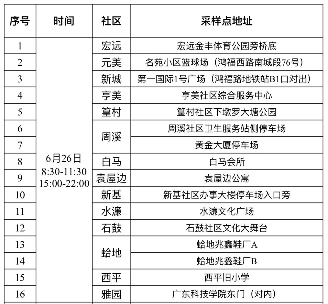 自6月25日至6月30日,凤岗镇继续开放12个便民核酸检测采样点(详见附表),请大家就近进行免费核酸检测,以便生活出行。具体如下: