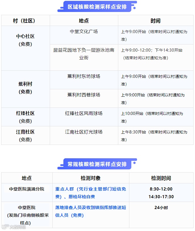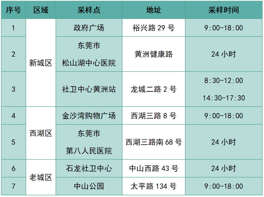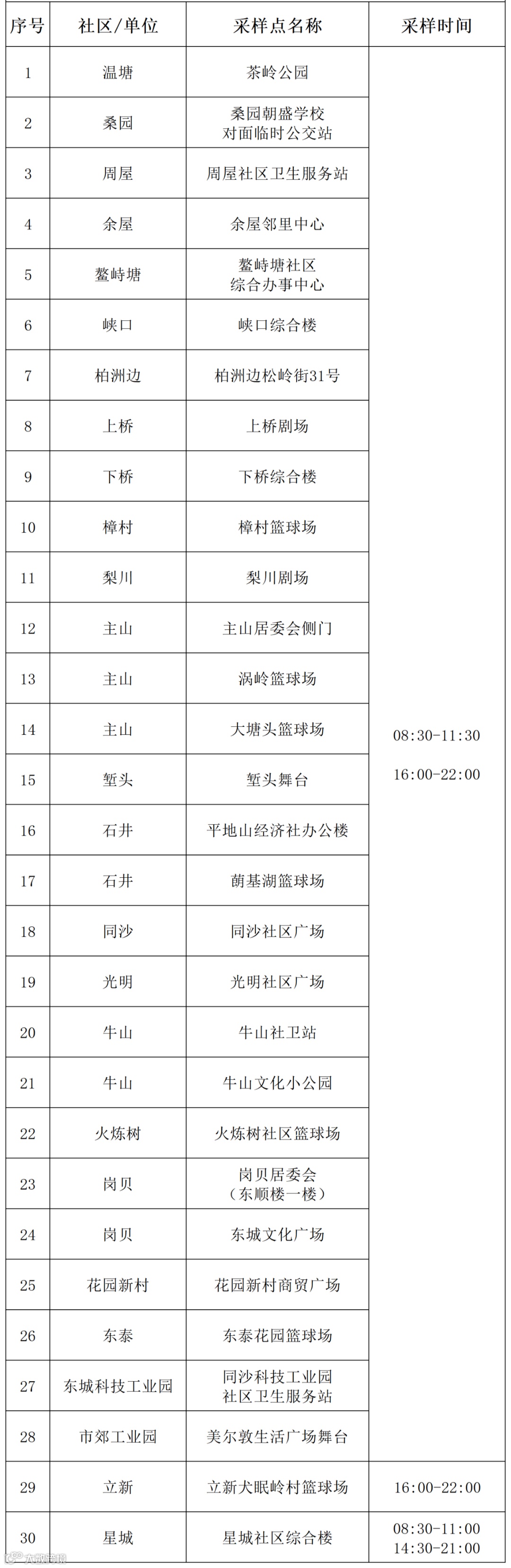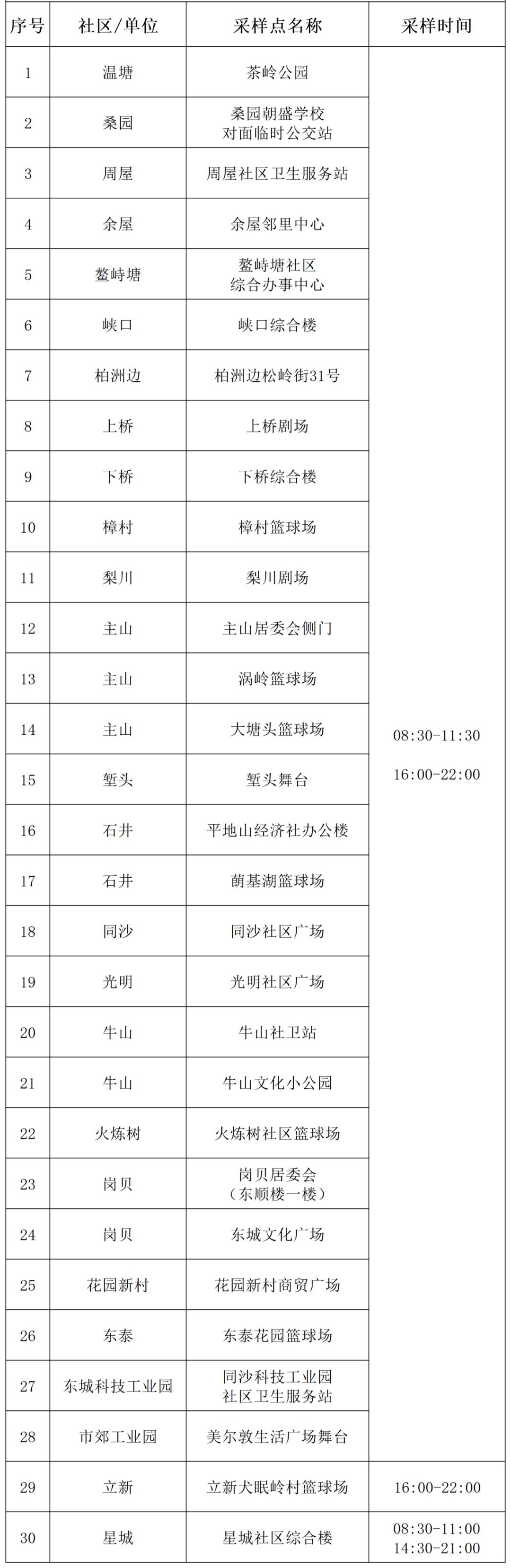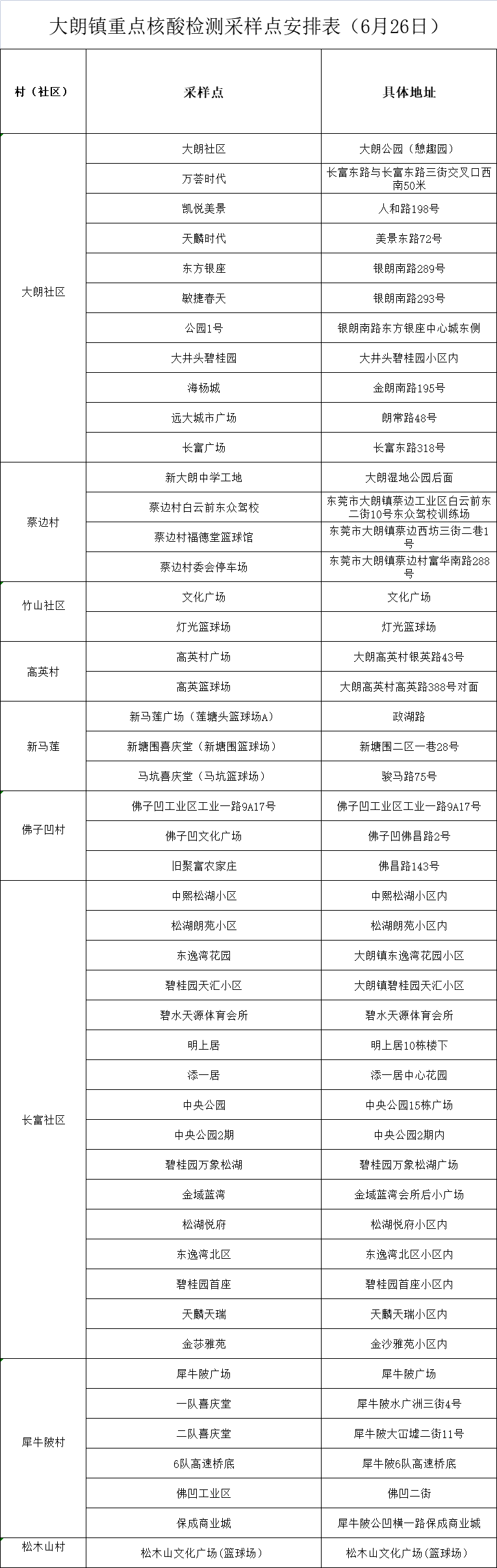 1、核酸抽检期间,保留大朗体育馆(24小时)、大朗社区卫生服务中心(8:00-12:00;14:30-20:00)2个便民核酸采样点(免费),其他便民采样点暂停服务。