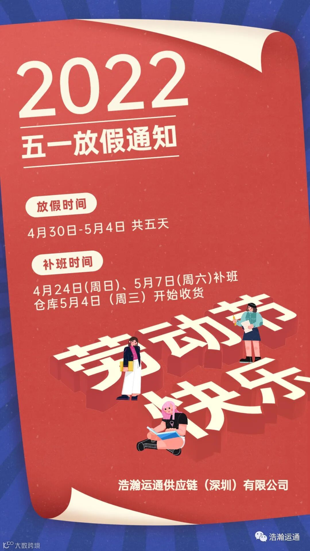 感谢您一直以来对浩瀚运通的支持和信任,根据《国务院办公厅关于2022年部分节假日安排的通知》,并结合本公司实际情况,现对五一劳动节假期做如下安排: