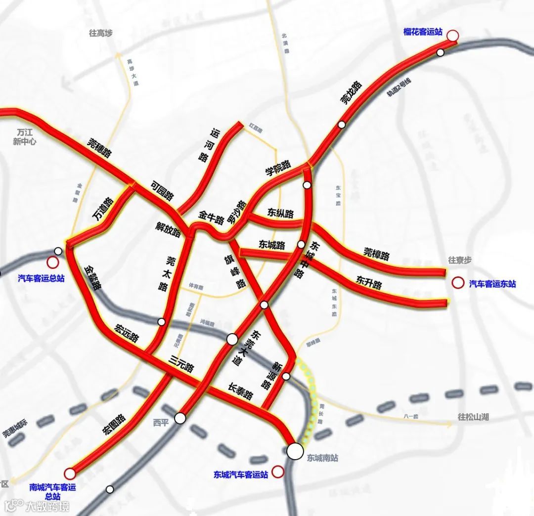 其中,“双环”为万道路-金鳌路-宏远路-莞太路-解放路-可园路,莞太路-三元路-长泰路-新源路-旗峰路-金牛路。“放射”为莞穗路、运河路、宏图路、东城路、东升路、东纵路、莞樟路、罗沙路、学院路、莞龙路。“中轴强化”为东莞大道-东城中路。
