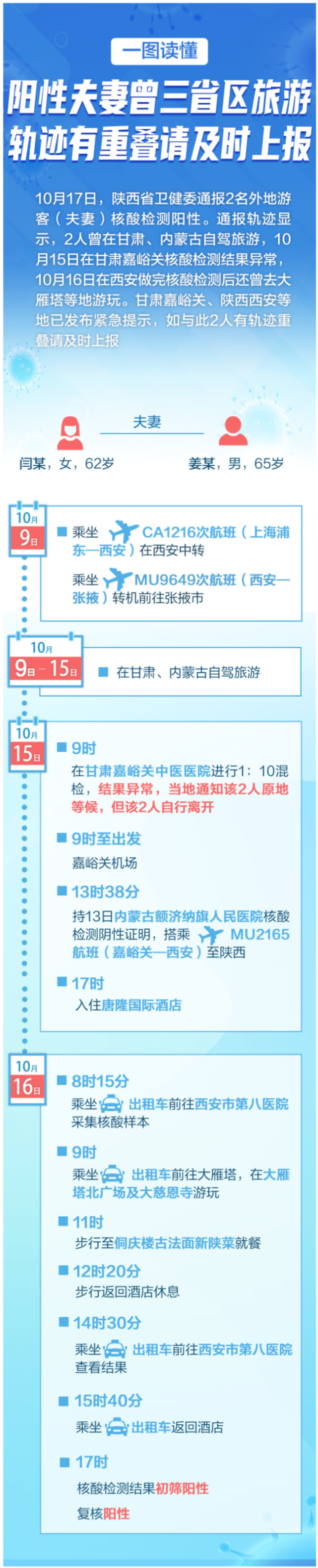 10月17日,陕西省卫健委通报2名外地游客(夫妻)核酸检测阳性。通报轨迹显示,2人曾在甘肃、内蒙古自驾旅游,10月15日在甘肃嘉峪关核酸检测结果异常,10月16日在西安做完核酸检测后还曾去大雁塔等地游玩。
