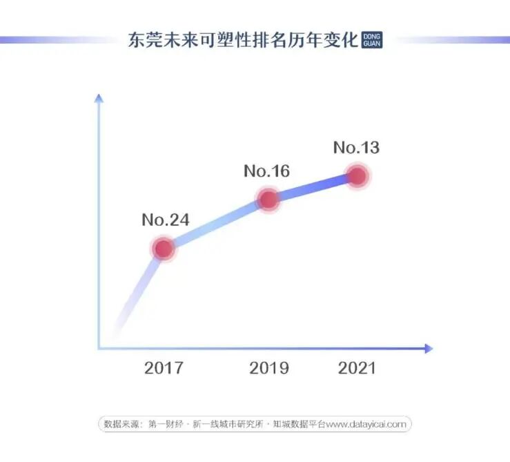 第一财经·新一线城市研究所每年在对全国城市进行模型测算时,城市未来可塑性都是评价体系中必不可少的一个重要维度。经过对创新氛围指数、人才吸引力指数、消费潜力指数、城市规模与增长指数的综合计算,东莞从2017年进入新一线城市之列至今,每年的未来可塑性排名及数值均有上升,城市发展趋势一年优于一年。