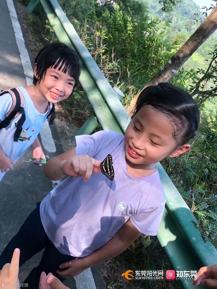 来回8公里的溪谷山路里,孩子们看到了闪动着宝石蓝光芒的巴黎翠凤蝶、用老虎模样斑纹警告捕猎者的虎斑蝶、重口味的琉璃蛱蝶……现场惊叹声不断。当孩子们停驻在溪水边戏水的时候,一只“热情”的螯蛱蝶飞到他们的帽子上、落在肩头手臂上,还不停地“轻吻”稚嫩的脸部。
