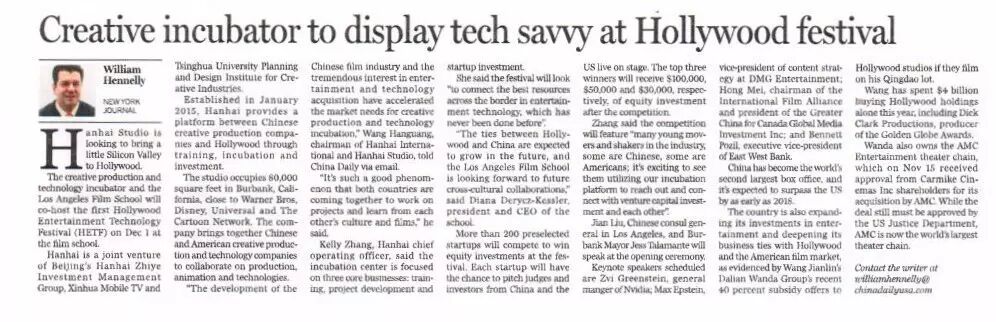 北京洛杉矶文化创意产业园Hanhai Studio和洛杉矶电影学院共同主办的首届好莱坞娱乐科技节将于本周四盛大开幕,各方筹备进入最后冲刺阶段,中美主流媒体也纷纷聚焦本次活动。11月24日,China Daily USA(《中国日报》美国版)在二版“走遍美国”刊登名为《Creative Incubator to Display Tech Savvy at Hollywood Festival(文创孵化器将在好莱坞展示科技亮点)》的文章。