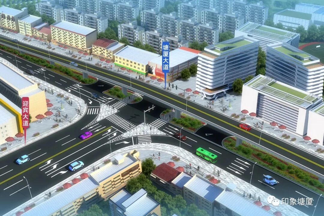 塘厦大道立交工程建成后,可分流塘厦大道中车流,南来北往的直行车辆经过迎宾大道跨铁路桥路口时,将不需要等红绿灯,可直接从高架桥上通过;需要从塘厦大道转入迎宾大道跨铁路桥的车辆,可走桥下辅道,有效缓解交通压力。