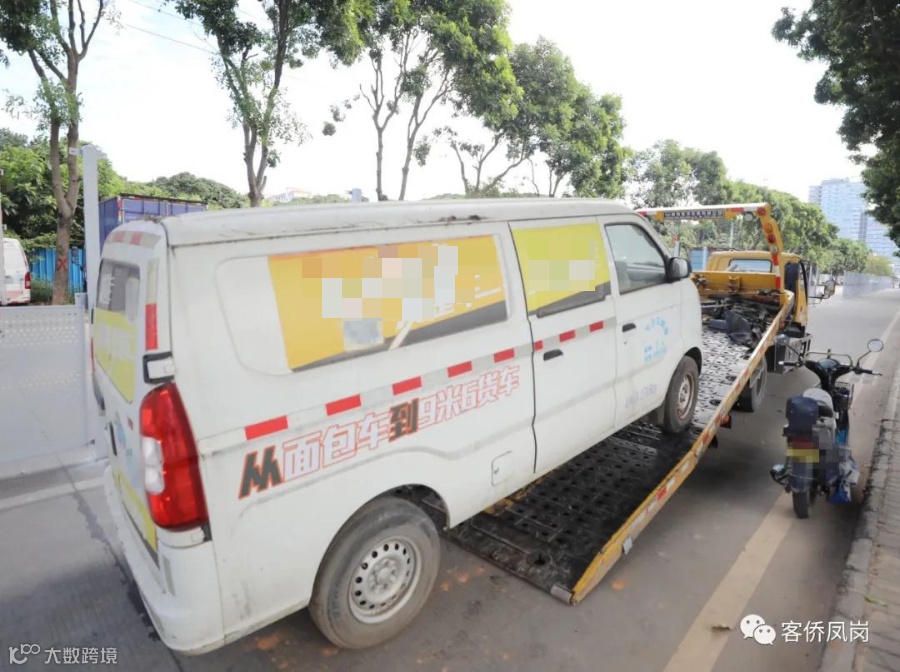 在凤凰围路,道路一侧已经竖起围挡,设置交通警示灯,工作人员正逐一对人行道违停的车辆进行拖车处理。