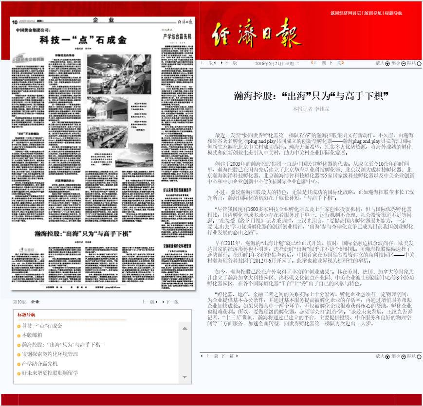 “孵化器、地产、金融三者之间的关系实际上十分紧密。孵化企业必须有一定物理空间,为企业提供基本办公条件,并通过基本服务提高被孵化企业的存活率,再通过增值服务帮助企业加快成长。如果只做其中一两个环节,不仅被孵化企业很难获得核心的帮助,孵化企业也很难获利。所以,要做顶级的孵化器,必须学会打‘组合拳’。”谈及未来发展,王汉光告诉记者,“十三五”期间,瀚海将通过已建立的平台,主要提供投资、中介服务和良好的物理空间等三方面服务,加速全面转型,向世界孵化器第一梯队再次迈出一大步。
