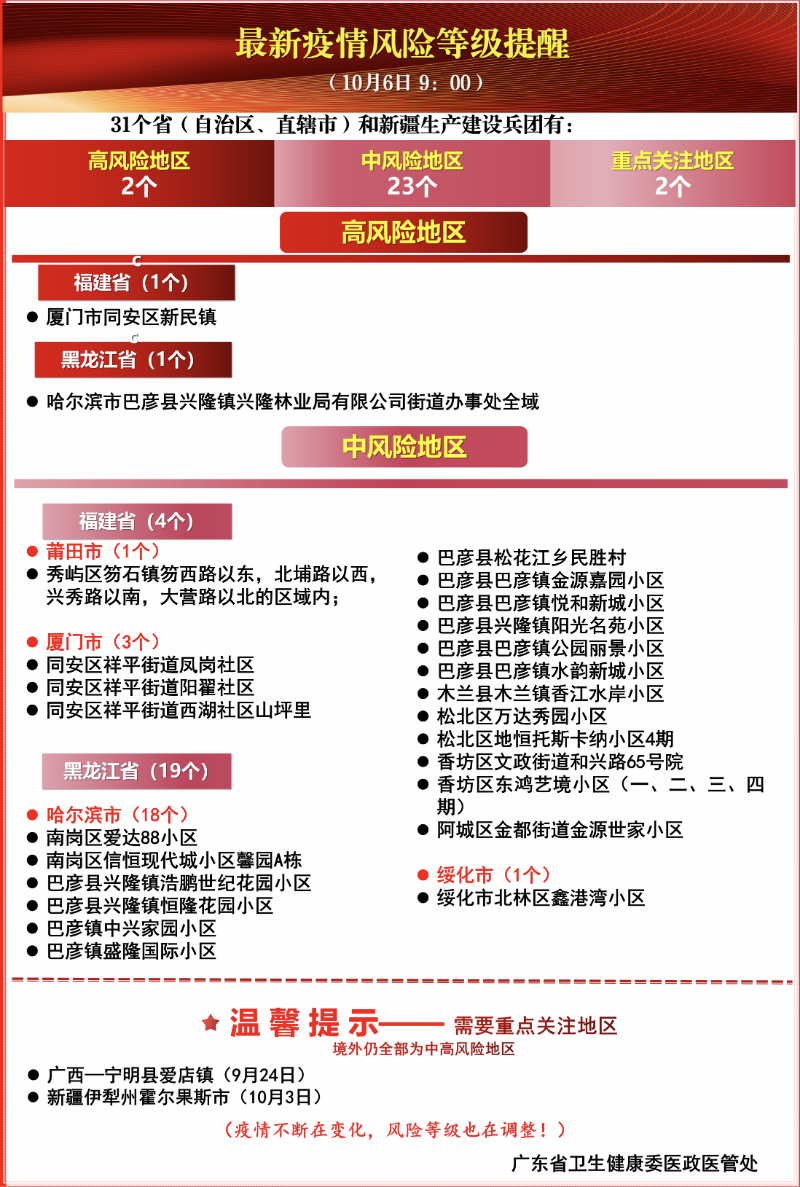 附:最新疫情风险等级提醒(10月6日9时版)