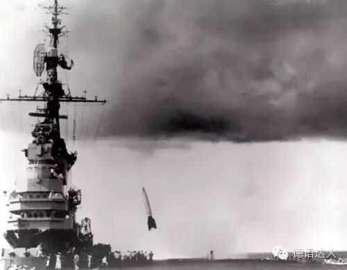 美国海军航空母舰中途岛号正试射从德军手中俘虏的V-2火箭