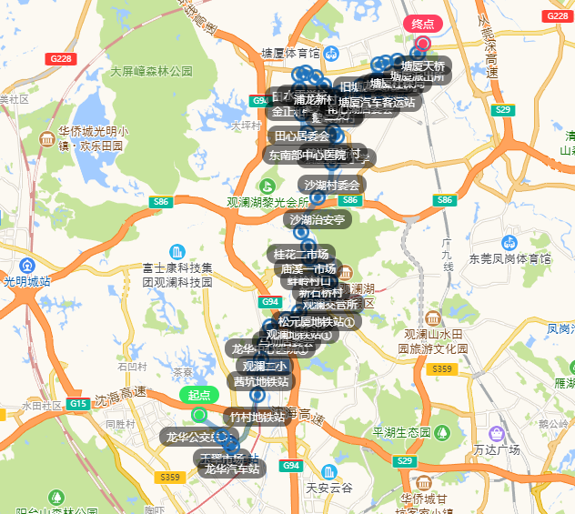 龙华公交总站、玉翠市场、龙华汽车站、竹村地铁站、茜坑地铁站、观澜二小、龙华中心医院①、马坜居委会、观澜地铁站①、岗头村、松元厦地铁站①、观澜交管所、新石桥村、蚌岭村口、庙溪一市场、桂花二市场、沙湖治安亭、沙湖村委会、塘厦第三小学、鹤湖围新村、东南部中心医院、田心居委会、金正和百货、田心治安队、水霖学校、浦龙新村、溪头旧村、鹅岭新村、三友厂、莆心湖居委会、塘厦汽车客运站、旧塘厦人民医院、龙景花园、塘厦社保局、塘厦派出所、塘厦天桥