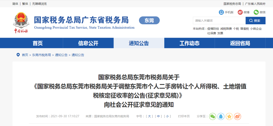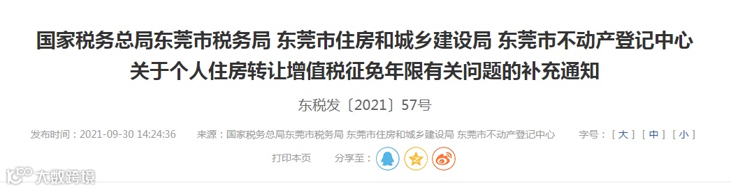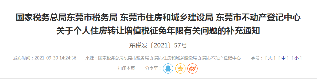 9月30日,国家税务总局东莞市税务局、东莞市住房和城乡建设局、东莞市不动产登记中心联合下发《关于个人住房转让增值税征免年限有关问题的补充通知(东税发〔2021〕57号)》。