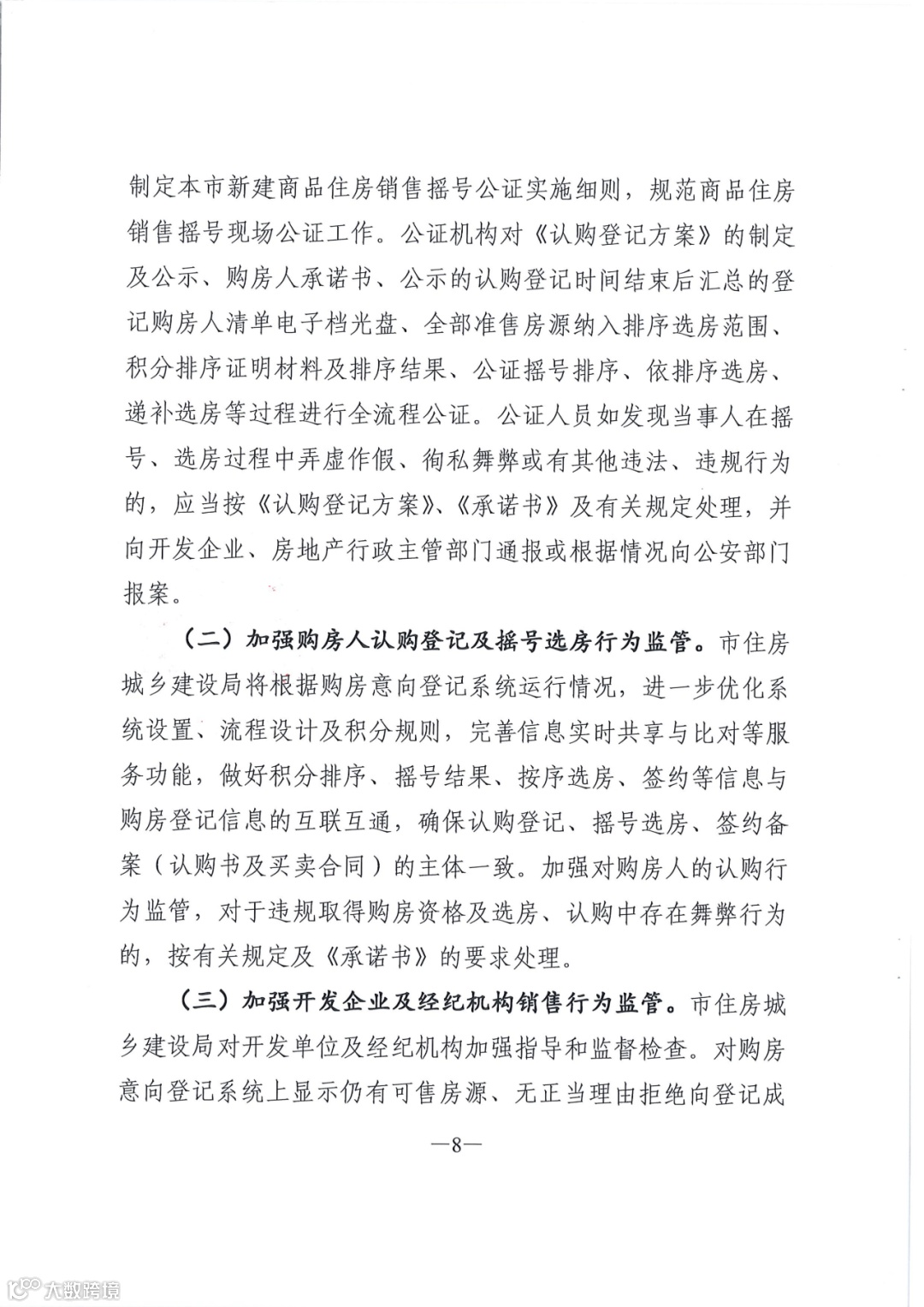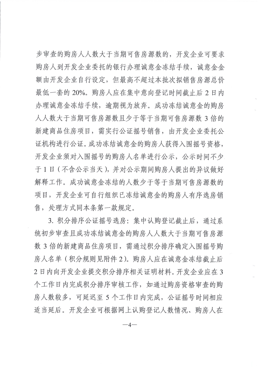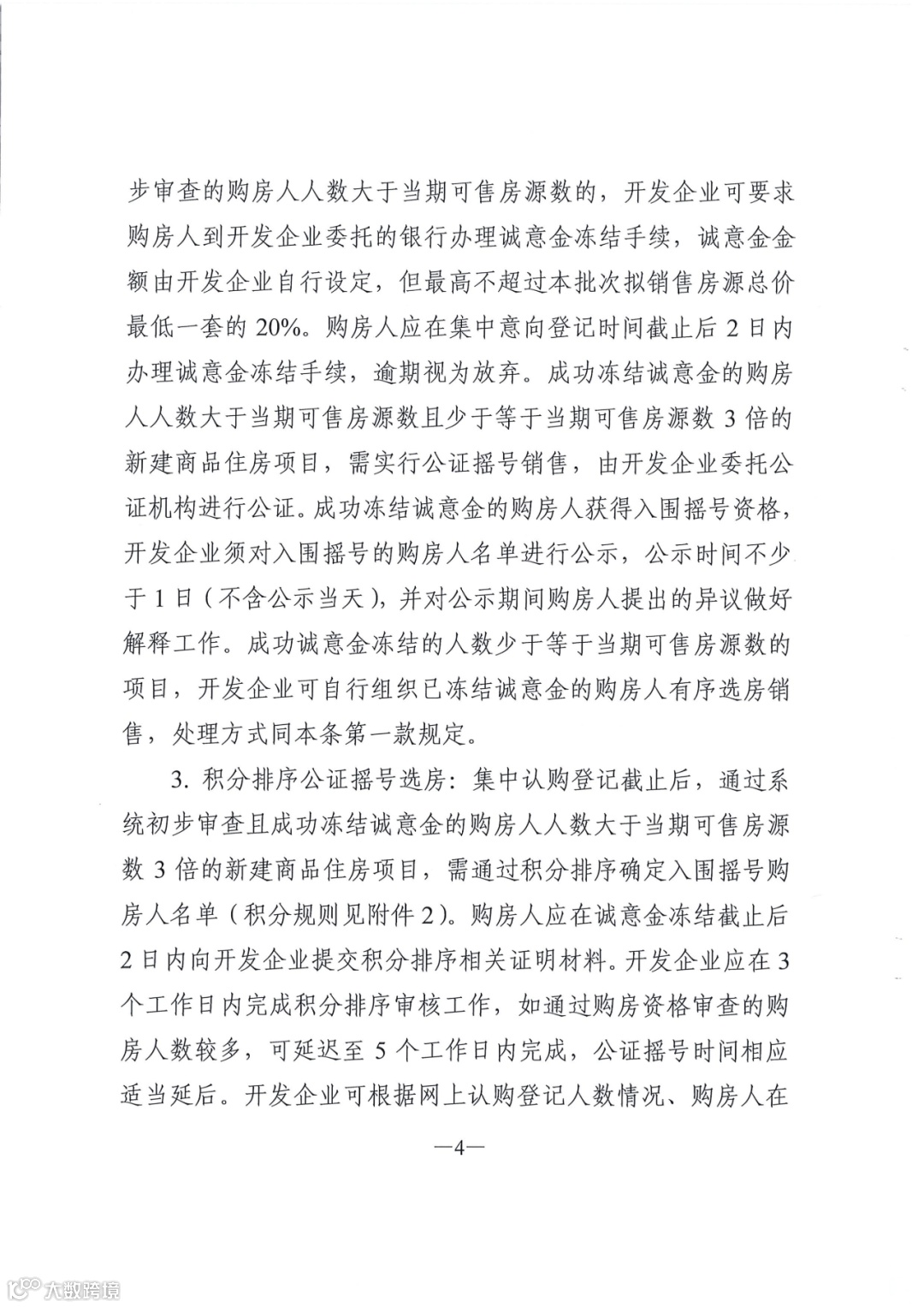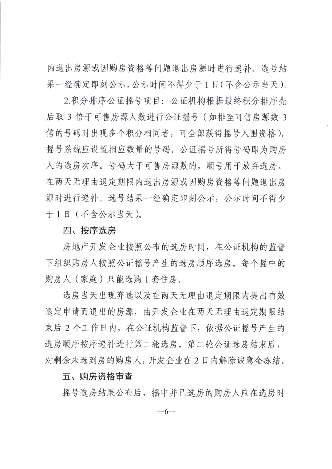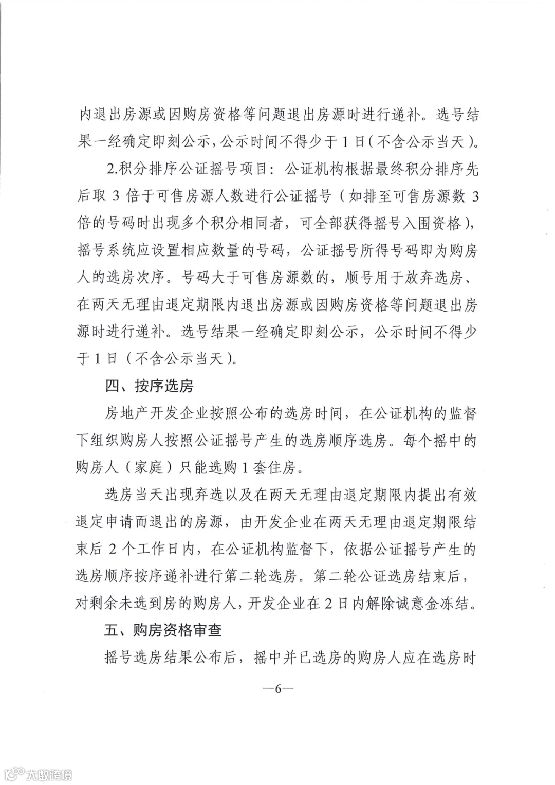 4、积分排序公证摇号选房:初步审查且成功冻结诚意金的购房人人数大于当期可售房源数3倍的新建商品住房项目,需通过积分排序确定入围摇号购房人名单。