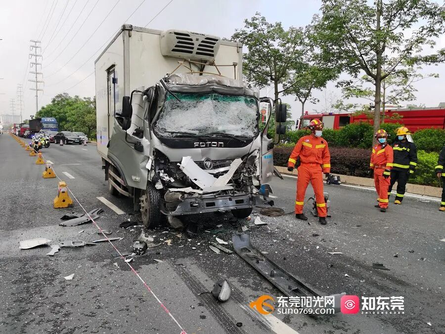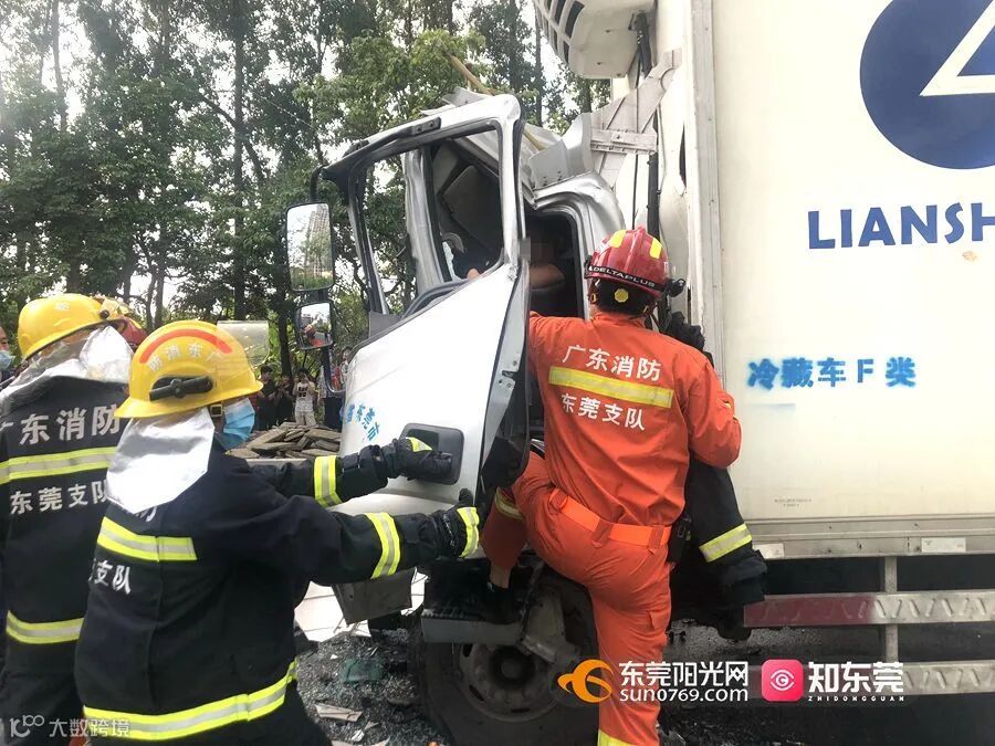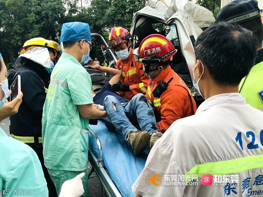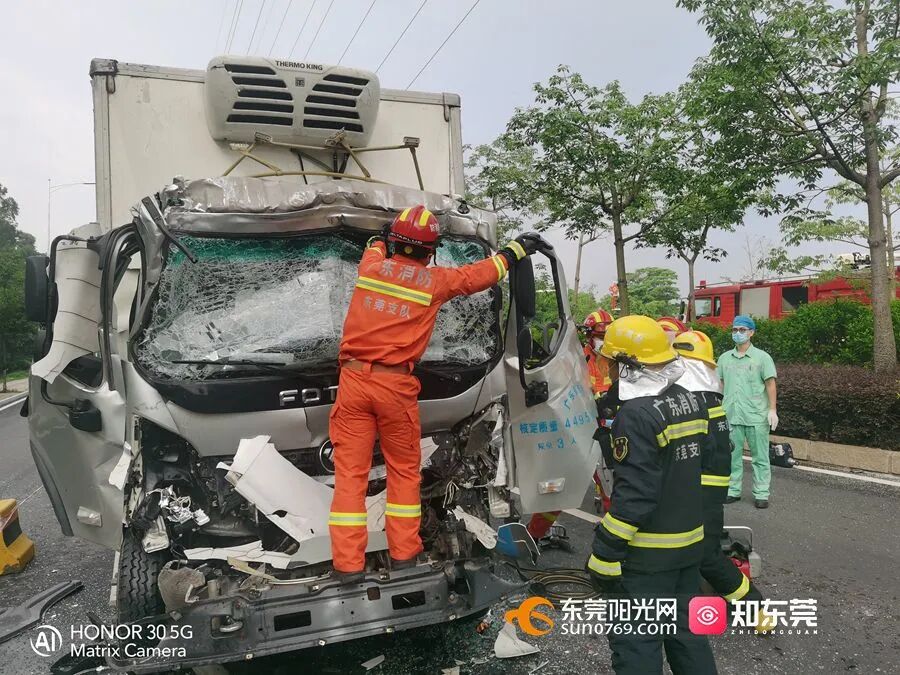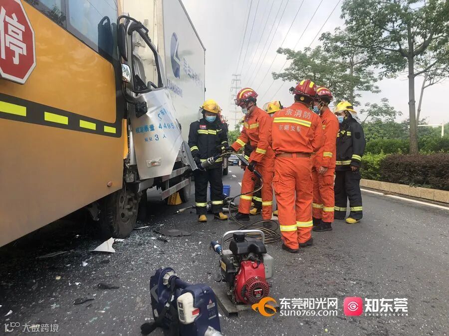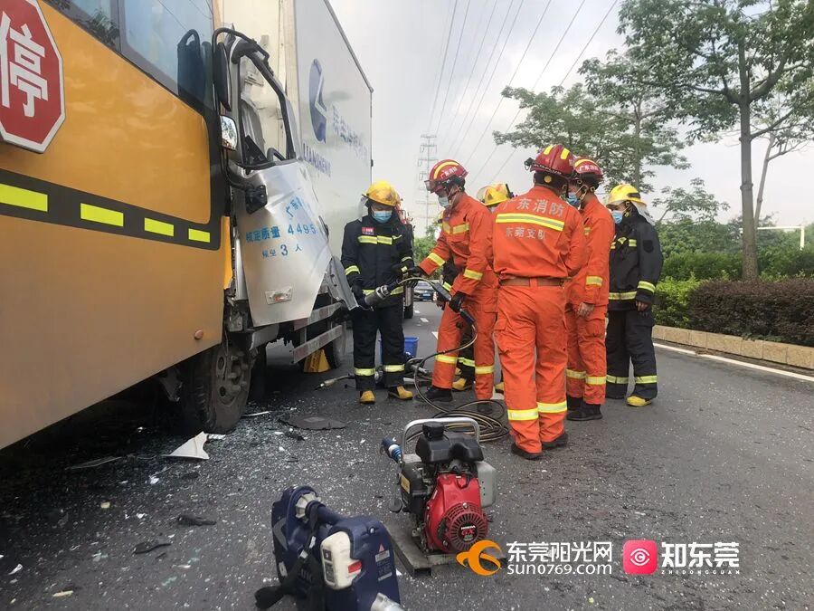 指挥员立即安排警戒组配合交警警戒,做好临时交通管制,指挥校车移到安全位置,并安排1台重型消防车做好牵引准备;救援组首先对被困人员的头部和双腿进行保护,再使用利用玻璃剪对货车前挡风玻璃进行局部破拆,布置牵引受力点以及液压破拆工具组。