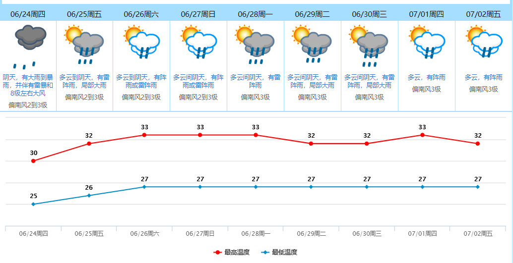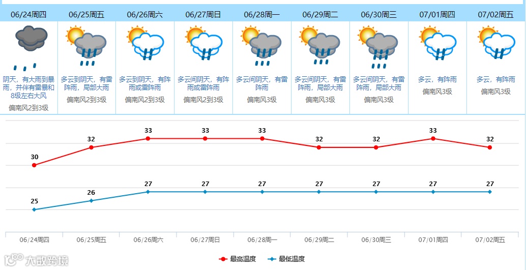 25-27日降雨减弱,有阵雨或雷阵雨,局部雨势较大;