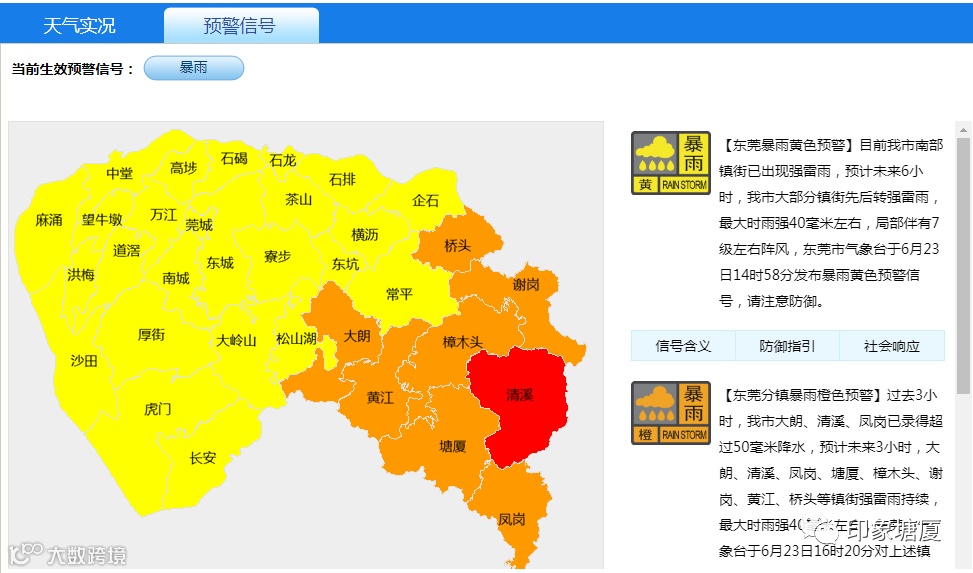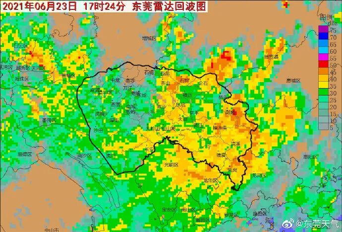 截至18时,过去1小时,我市东部镇街出现了强雷雨,全市共1个镇街录得超过50毫米降水,最大降水为清溪60.4毫米,其次为樟木头40.6毫米。预计未来1小时清溪、凤岗、樟木头、谢岗等镇街仍有较强雷雨,最大时雨强30到40毫米,请继续做好防御。东莞市气象台6月23日18时09分发布