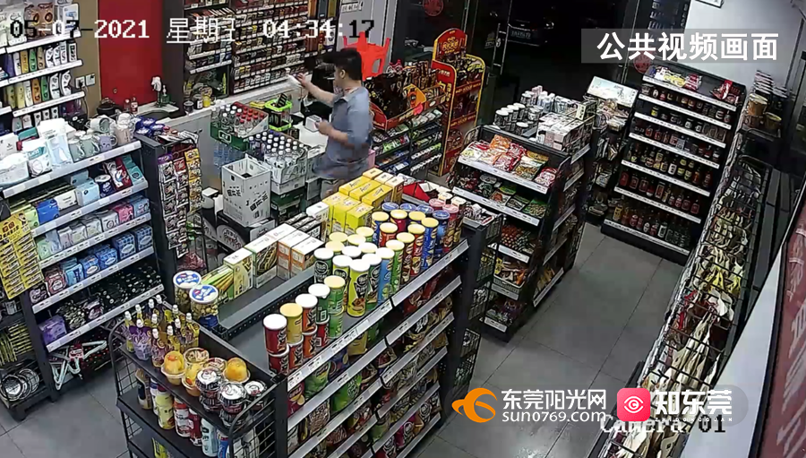 5月7日凌晨四点多,他听到隔壁便利店发出一连串响声,出门张望时,发现一名男子从便利店出来,拿起凳子砸向路边的小车,而看店的小张躲在一旁六神无主,“我在厕所洗拖把,听到声音出来,就发现那个男子在店里打砸,样子很吓人。”在曾先生建议下,小张报了警。
