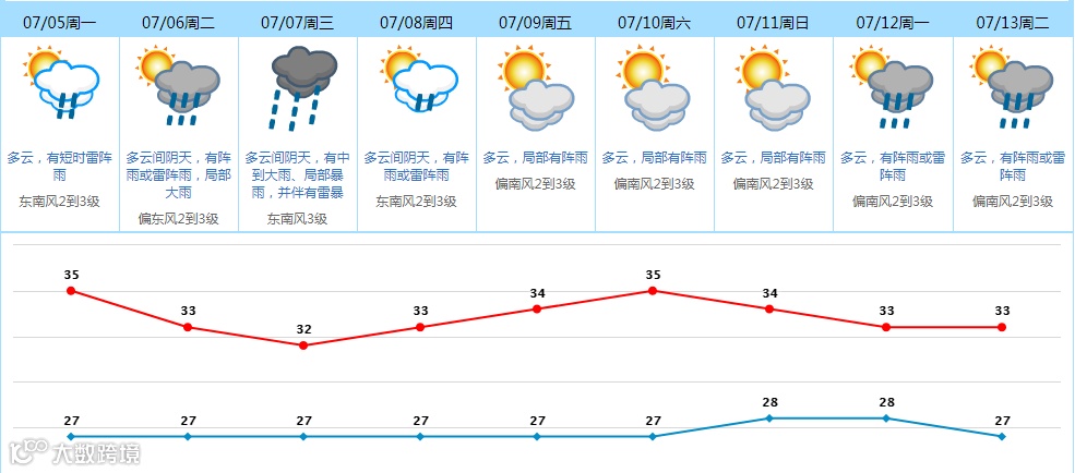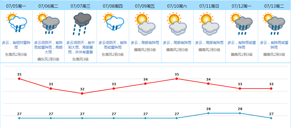 预计我市7月5日多云为主,有雷阵雨,局部大雨,天气炎热;
