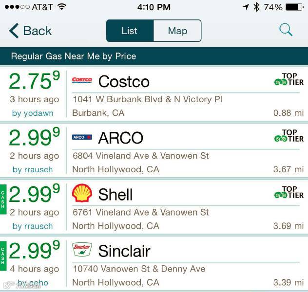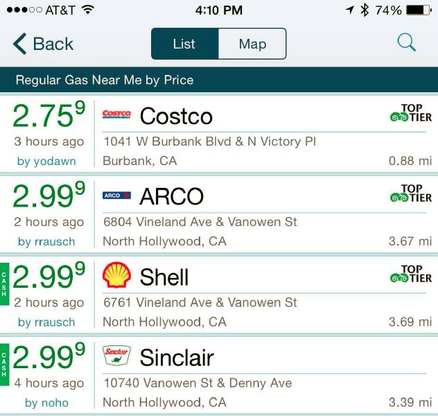 GasBuddy shows you exactly how long ago the price was updated (usually a few hours), and for the most part guarantees accuracy by having users report new rates constantly. A simple glance (filtered by price of course) and you’ll notice that Costco has by far the cheapest gas.