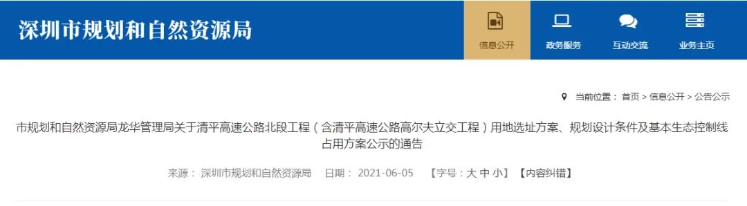 日前,深圳市规划和自然资源局龙华管理局公示了清平高速公路北段工程(含清平高速公路高尔夫立交工程)用地选址方案、规划设计条件及基本生态控制线占用方案。