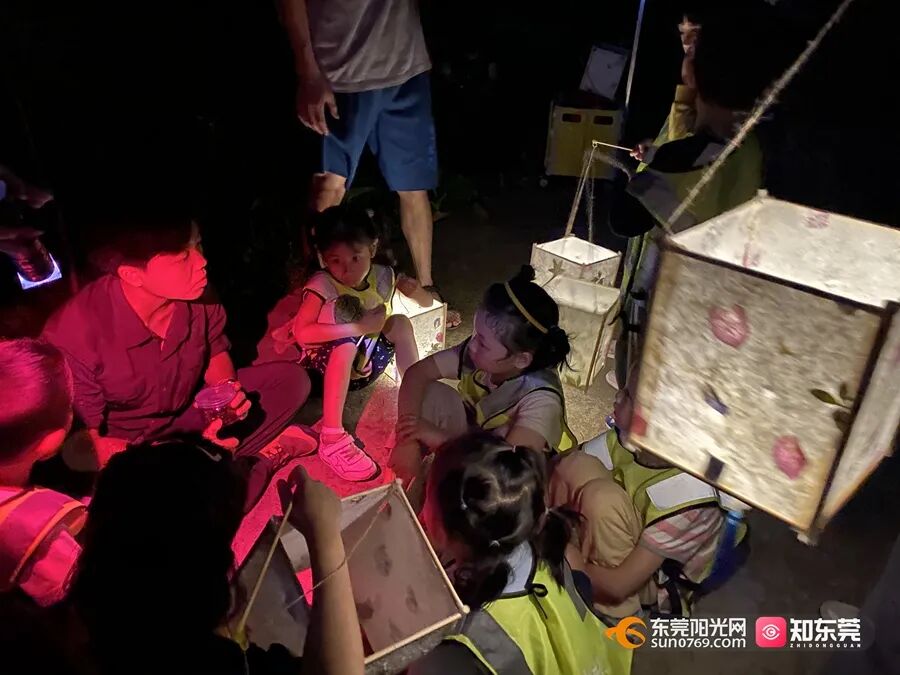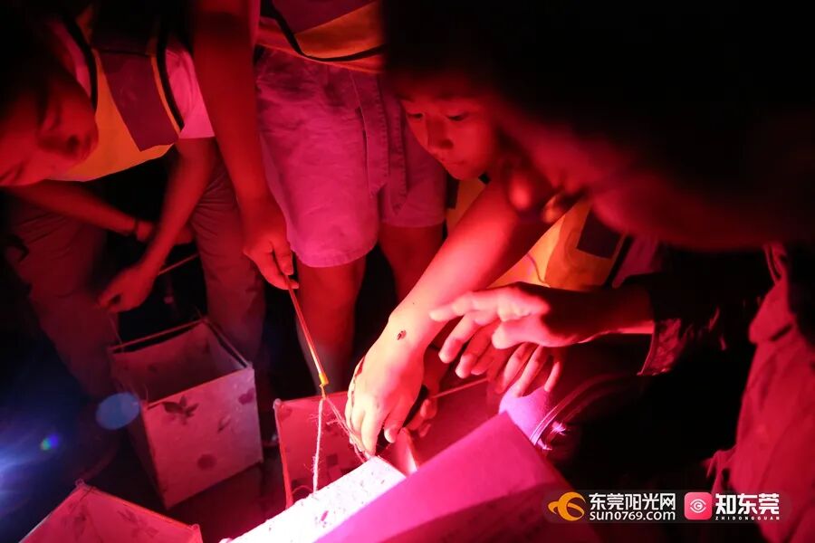 熄灯!为了减少对萤火虫的影响,观察活动全程在月光下进行,近距离接触的时候,老师只开启一只遮盖了红色光片的手电筒。静悄悄的夜,一只黄宽缘萤爬上了小七同学的肩膀上,大家投来羡慕的眼神。