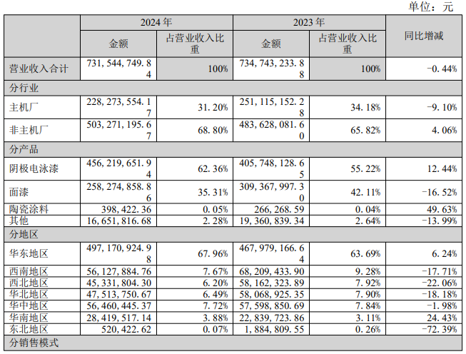 工业漆业务方面,金力泰产品包括水性发动机涂料、水性车桥涂料、水性工业高温清漆、水性钢制轮毂漆等,电动两轮车、电动三轮车是主要开拓领域。经过多年发展,电动两轮、三轮车市场终端需求向求质、求精转变。金力泰凭借汽车涂料头部企业的优势,迎来更多市场机遇。2023年已成功开拓电动车行业某知名品牌的广东、重庆基地以及电动三轮车、三轮篷车产业聚集地的部分优质客户。2024年,金力泰继续深化市场布局,加大在山东、江苏、天津等重要市场区域的开拓力度,通过提供定制化涂料解决方案,与多家客户建立长期稳定合作关系,进一步扩大了在工业涂料细分领域的市场份额。