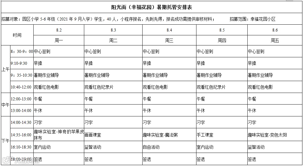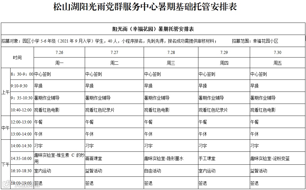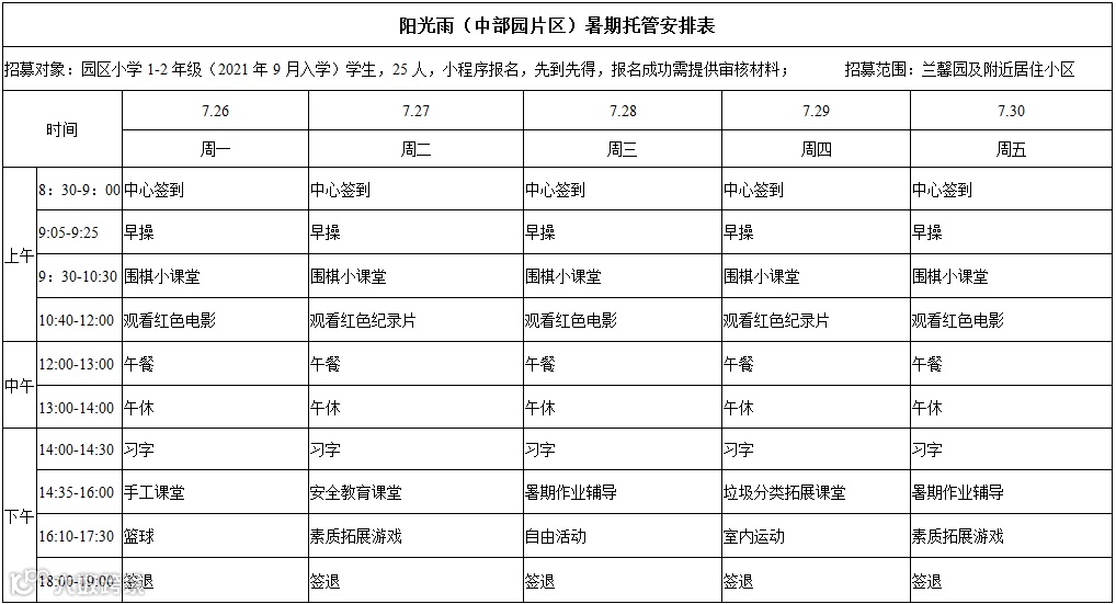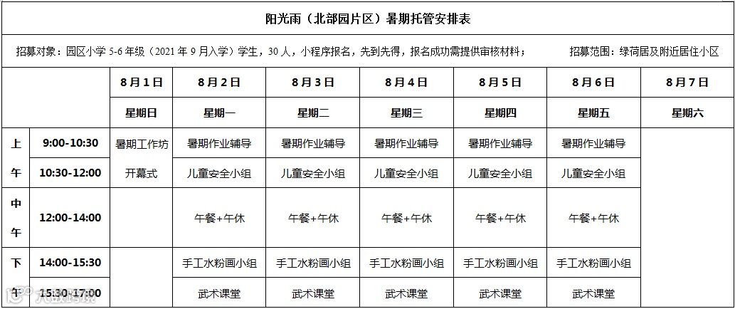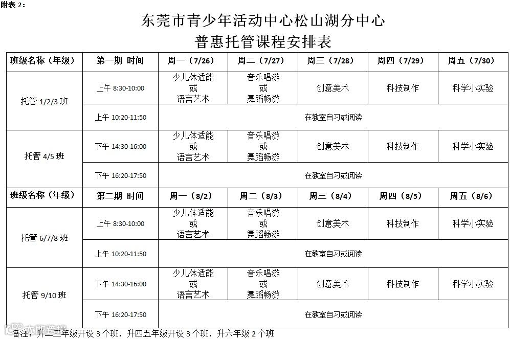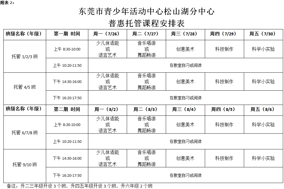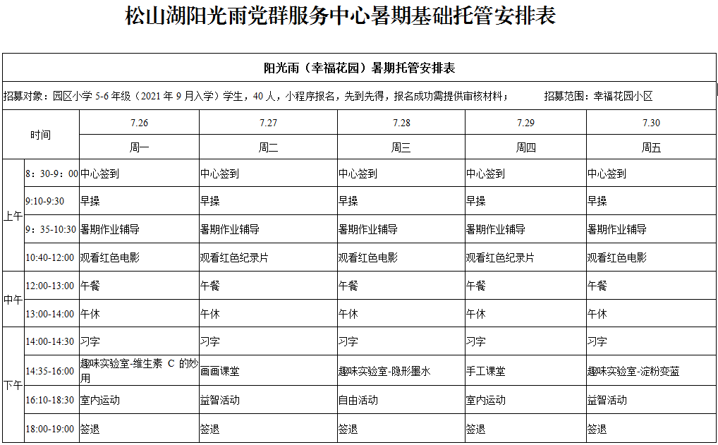服务时段原则上从7月19日到8月20日(不含周六、日),可分为2期。每期具体起始时间由各镇街试点学校结合实际安排。