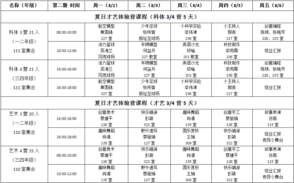 突显青少年活动中心优势,整合中心丰富多彩的才艺、科技、体育课程,组合成内容丰富、形式多样的营地课程。半天提供科体、艺术体验营,体适能训练营开展特色素质拓展服务。半天由专业的音乐、舞蹈、美术、科技、体育老师组织学生开展各类艺术、科技、体育的体验式活动课。每班设有带班老师和工作人员负责带班,确保学生学习和活动安全有序。