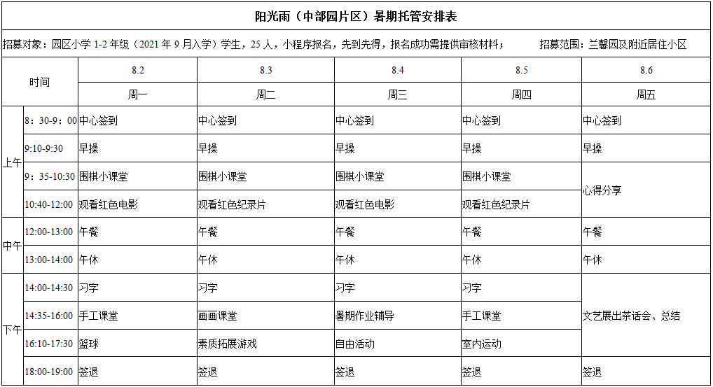 本次暑期托管服务分两期进行,第一期时间为7月19日-7月30日(星期六、日除外);第二期为8月9日-8月20日(星期六、日除外)。每天托管服务时间为8:30-17:30;其中12:00-14:30为午餐午休时间,学生可选择回家或在校内午餐午休。
