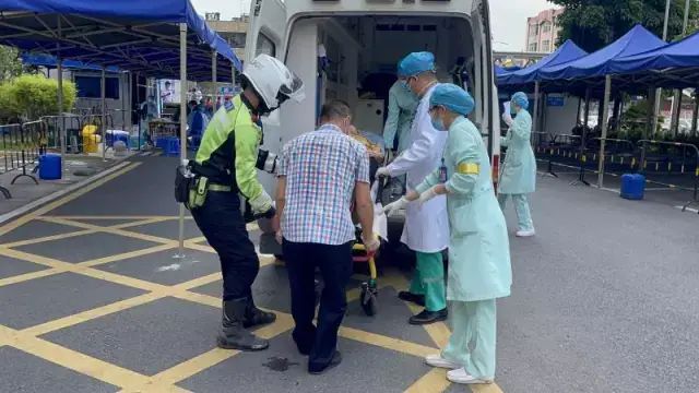 ▲寮步浮竹山核酸检测点在排队人群中一名老人晕倒,寮步铁骑迅速开通绿色通道一路护送120,安全送达寮步医院。