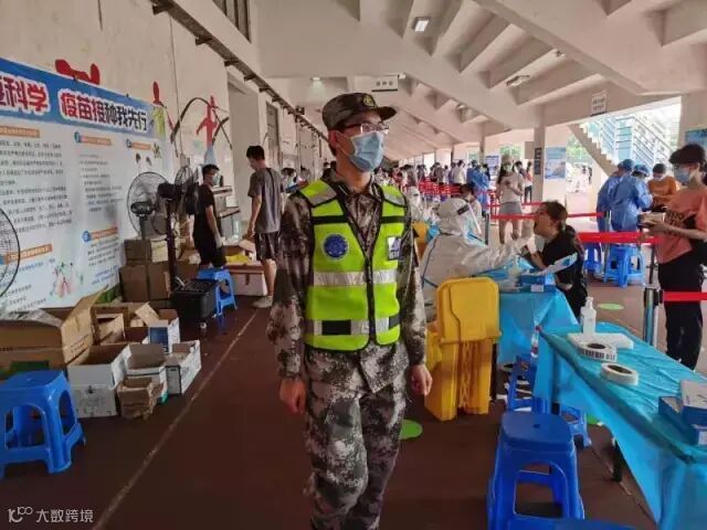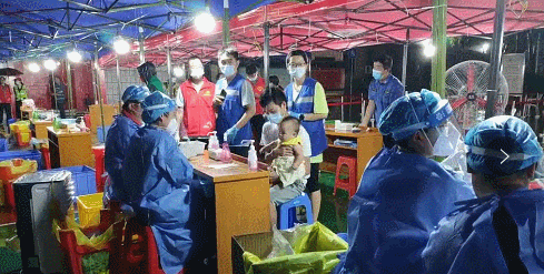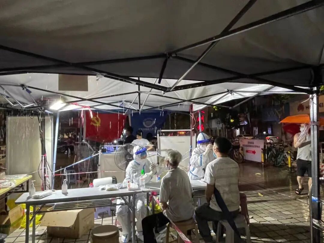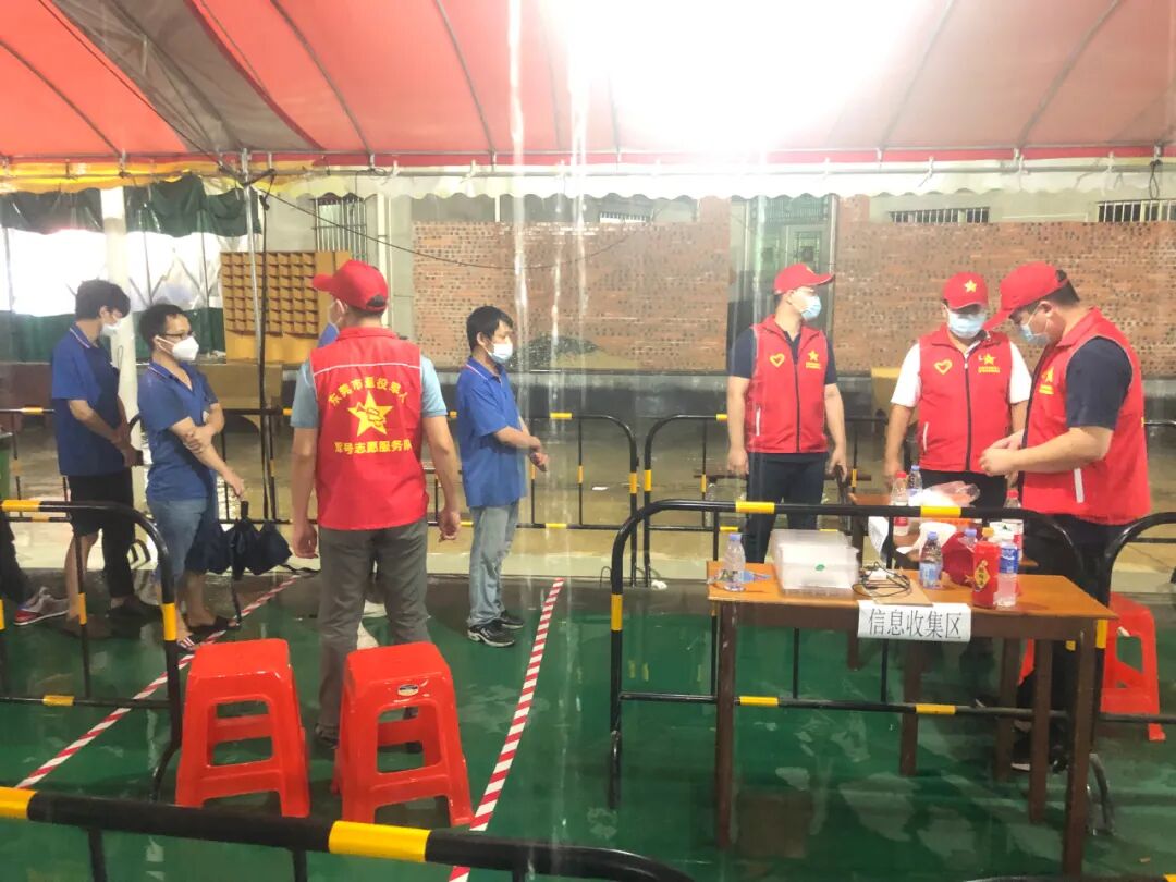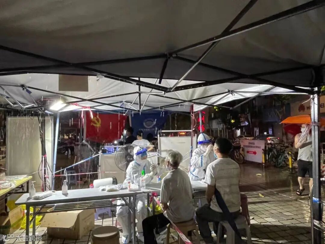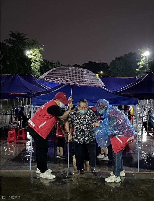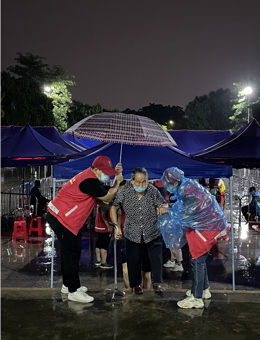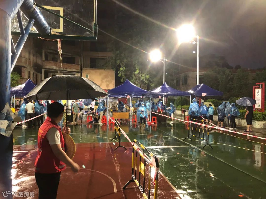▲核酸检测不结束,退役军人志愿者不撤退。20时30分许,大雨下,来自市退役军人事务局的党员志愿们依然坚守望牛墩赤滘村,“钉”在核酸检测一线。