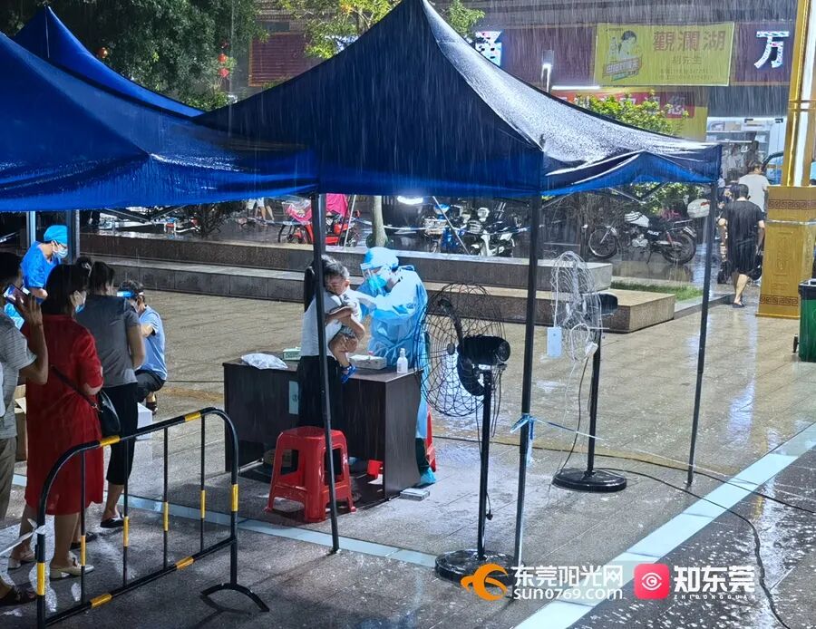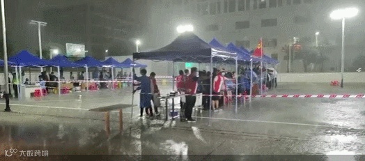 ▲企石镇文化中心广场核酸采样点,医护人员和各部门单位工作人员、志愿者,冒雨坚守岗位,为市民群众做核酸采样,筑牢防疫安全一线。