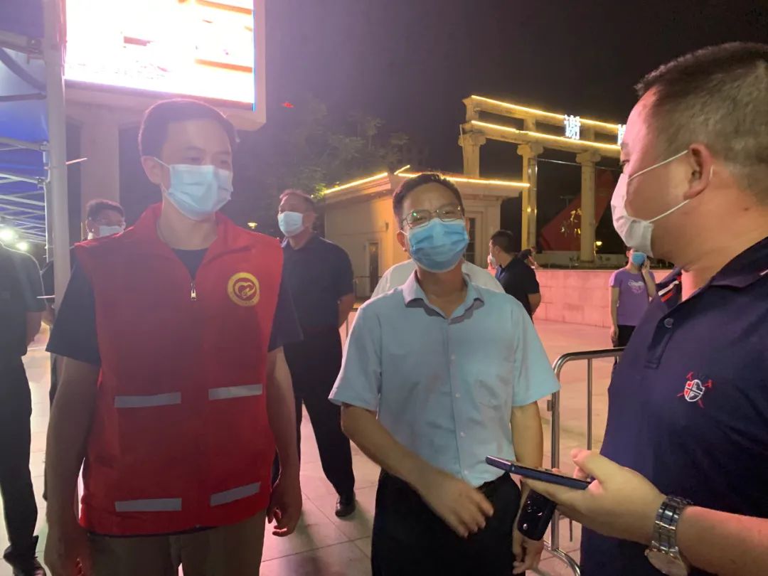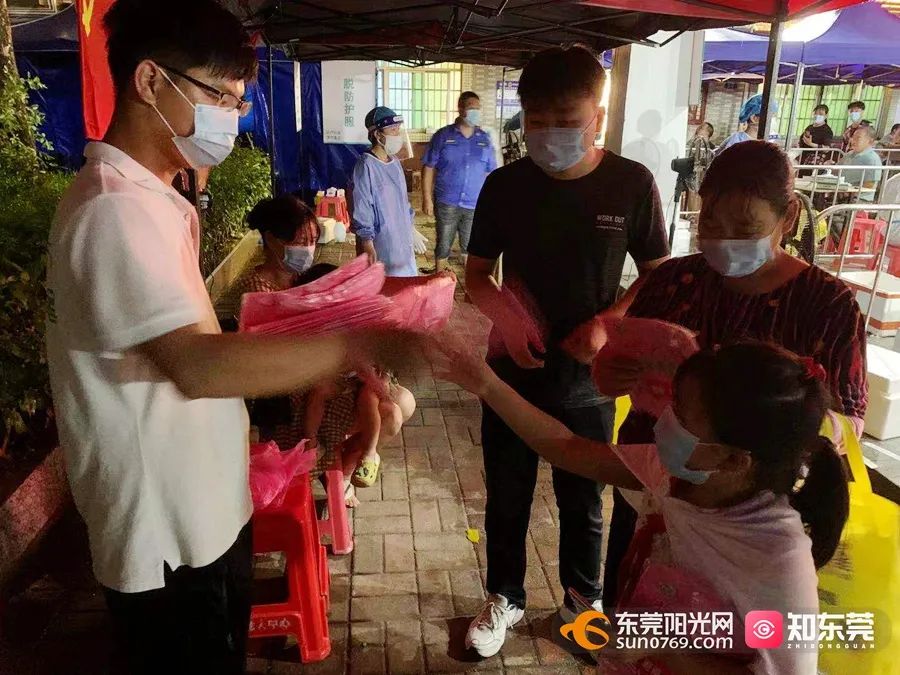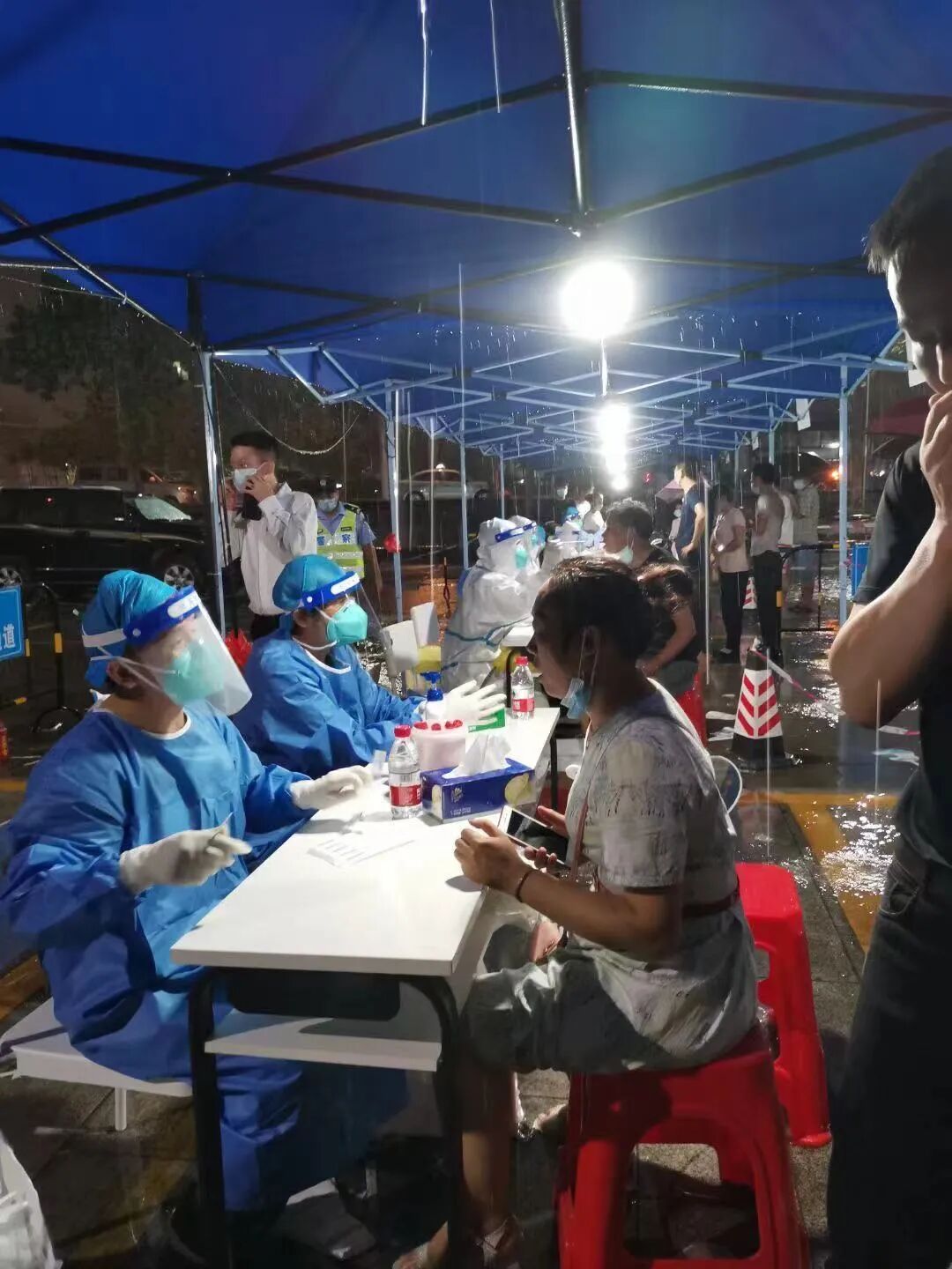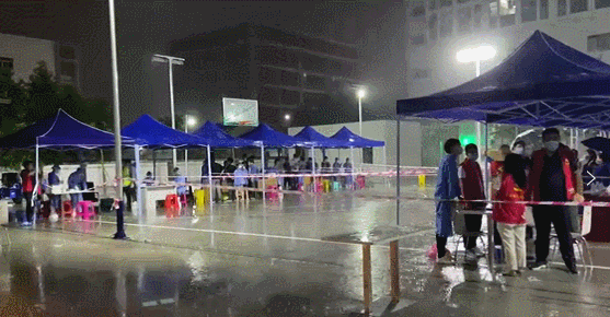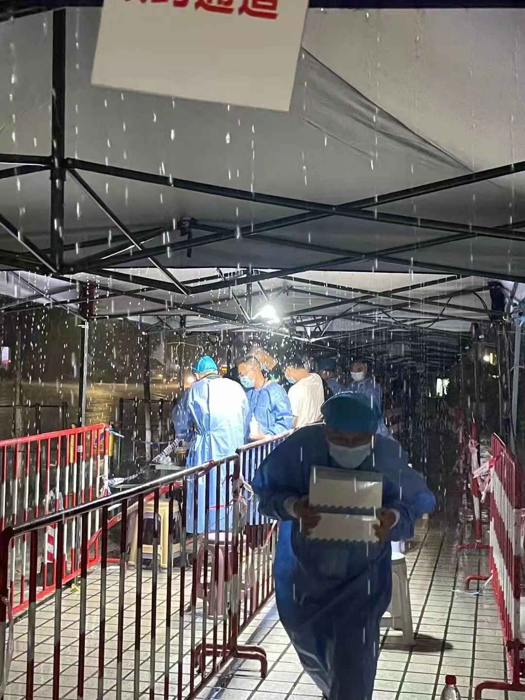▲烈日过后,骤雨降,夜幕下,来自市自然资源局的党员志愿者“白加黑”坚守在高埗镇颐龙湾、冼沙村两个核酸检测点。