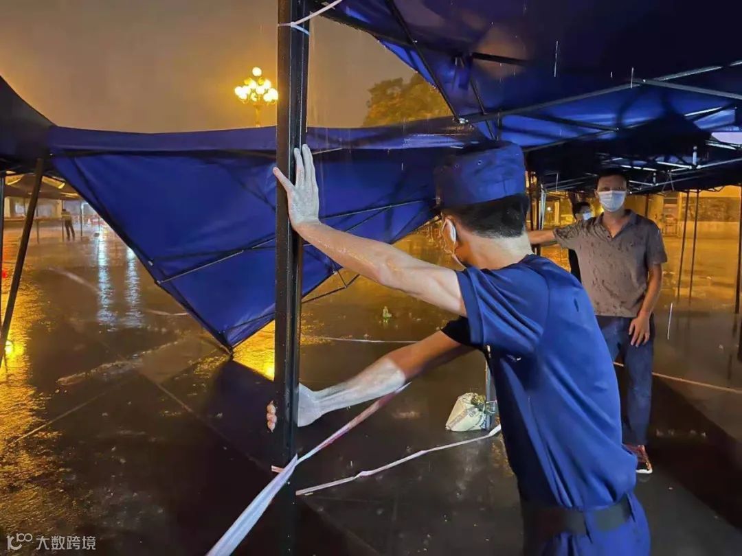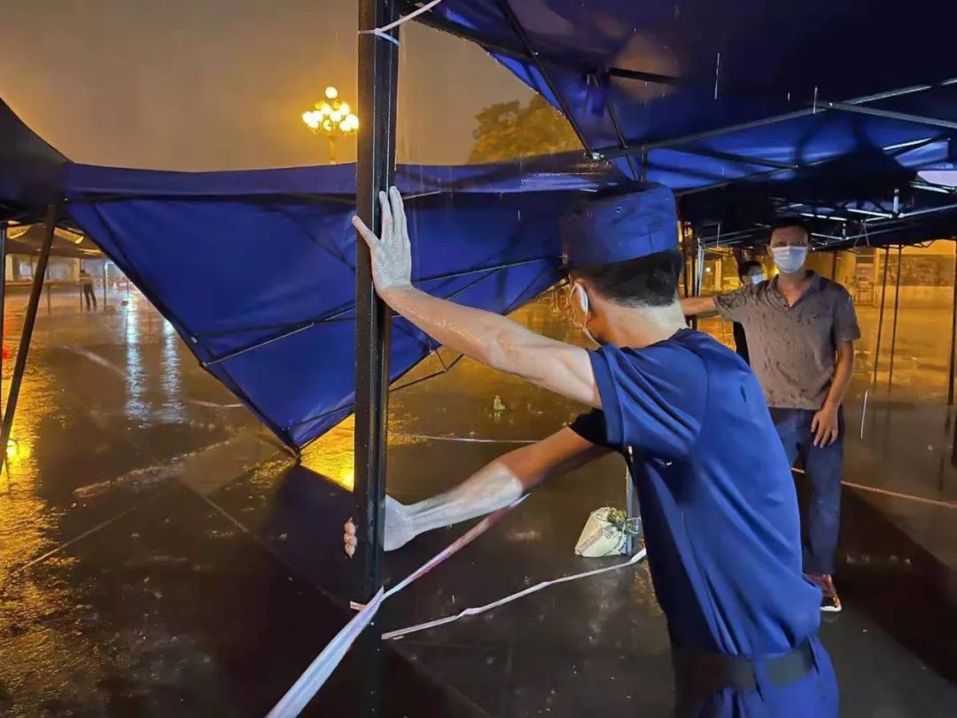 ▲大雨突降,来自石龙消防救援大队的指战员“白加黑”坚守在石龙镇政府广场、石龙职校、忠围村三个核酸检测点,为现场核酸检测的群众撑伞。