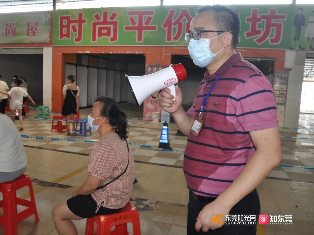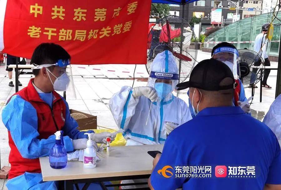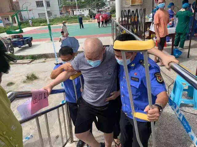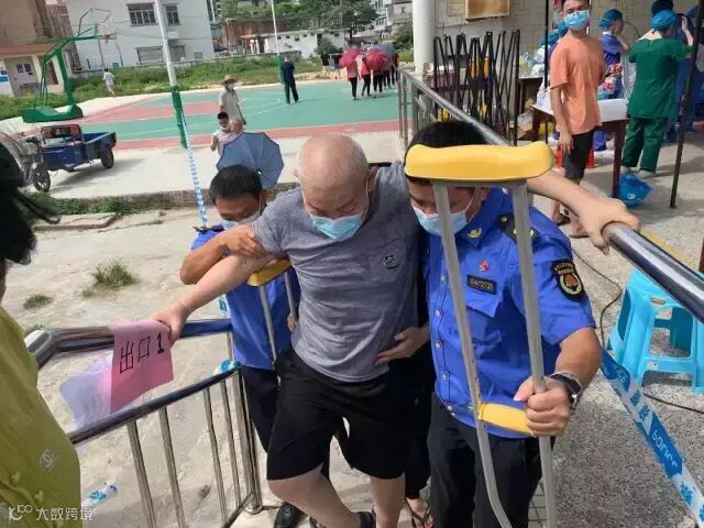 ▲常平城管分局工作人员在元江元村检测点护送行动不便老人完成核酸检测。