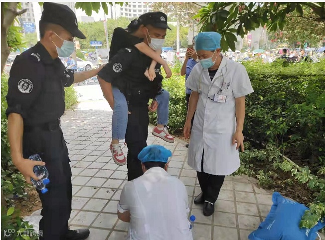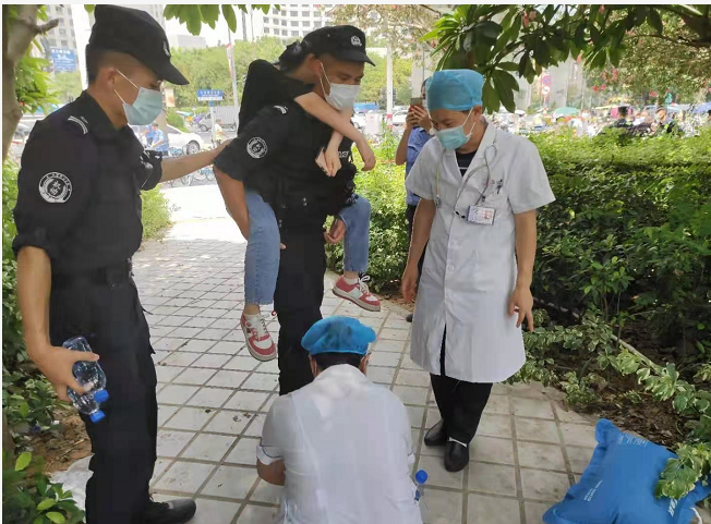 ▲昨日中午,长安金沙广场核酸检测点现场有一名女群众因排队时间过长发生中暑,巡警大队现场队员发现以后迅速背起她赶至医务点进行治疗。