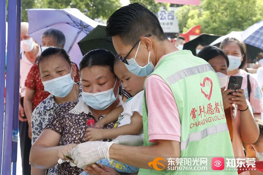 ▲在松山湖各检测点,义警帮助维持秩序、提醒扫码、帮助老人操作手机。