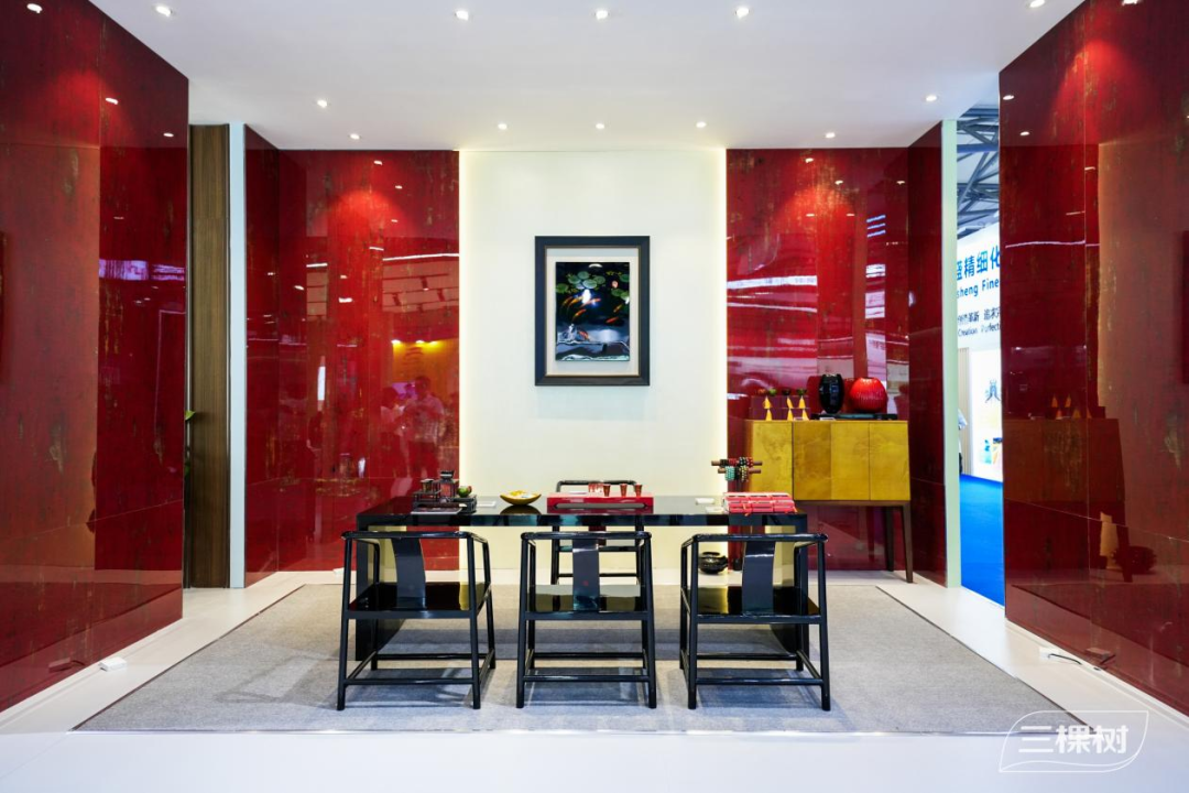 小森板大漆板以水性漆智能涂装工艺,纳米级精准复刻传统大漆的温润纹理与深邃层次,融合传统文化与现代审美,金丝婉转,朱华内敛,漆膜却告别有机溶剂,现场与大漆家具同席陈列,古典气韵与现代健康科技交相辉映,成为观众围观点赞的流量焦点。