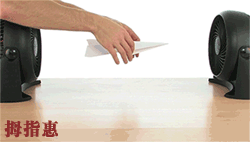 拿两个风扇对着吹,就可以让纸飞机一直保持飞行状态。在家就可以给宝宝玩风洞试验!
