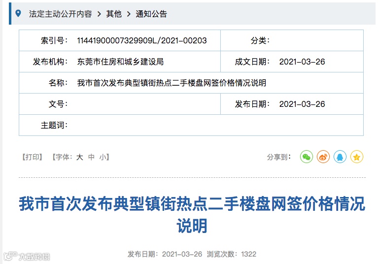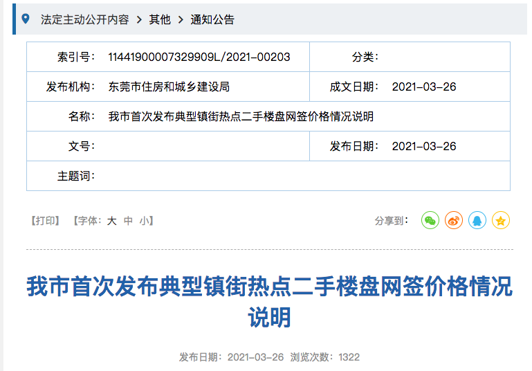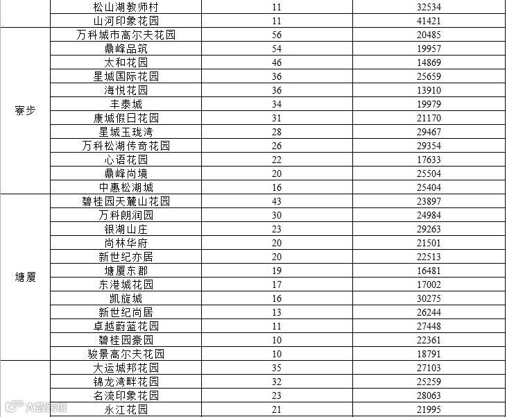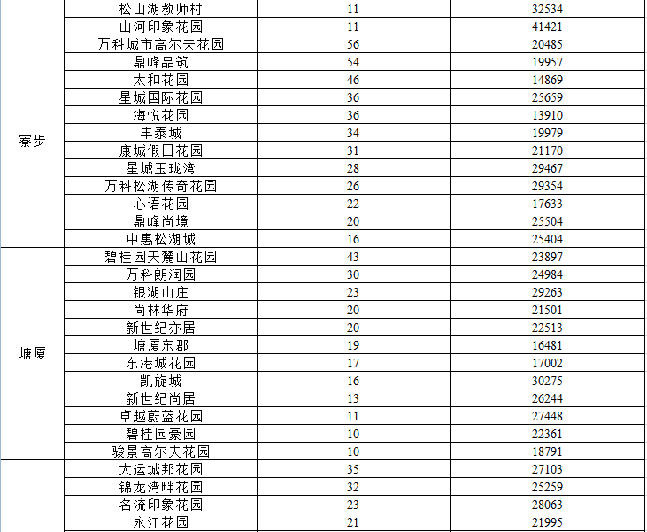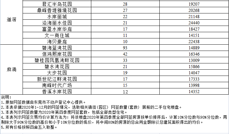 为进一步加强房价信息公开,提高二手住宅价格透明度,引导市场理性交易,根据《关于进一步加强房地产市场调控的通知》(东建〔2021〕6号)要求,东莞市住房城乡建设局会同市不动产登记中心,加强与专业调查统计机构合作,在每月定期公布各镇街(园区)二手住宅网上签约销售情况的基础上,抓紧开展典型镇街热点二手住宅楼盘网签交易价格统计工作,相关统计结果目前已正式发布。