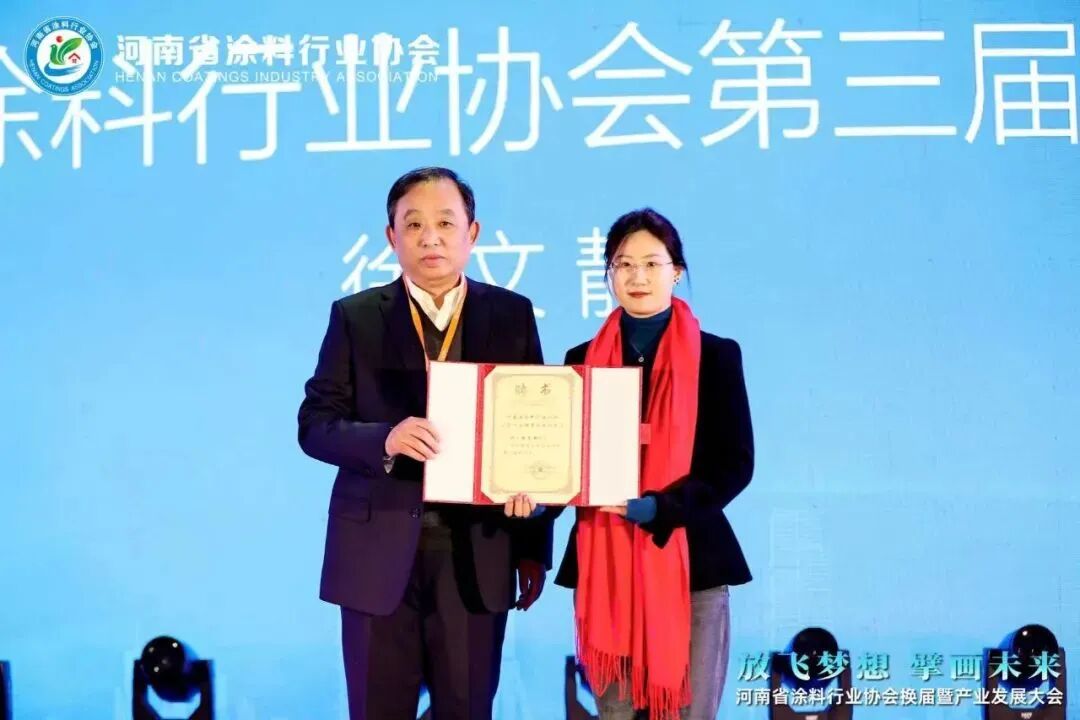 大会举行了隆重的授牌仪式,分别为第三届会长单位、常务副会长单位、副会长单位颁发牌匾,并为河南卧龙涂料科技有限公司董事会主席李国报颁发协会第三届名誉会长证书,为徐文静颁发协会第三届秘书长聘书。
